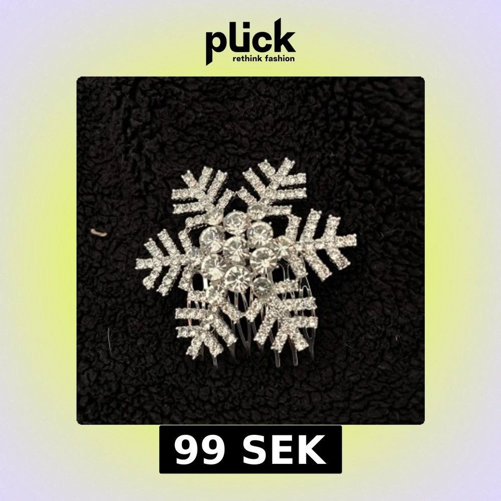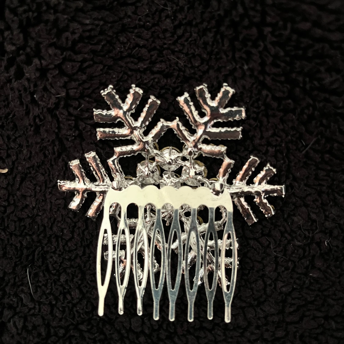 Elegant hårkam i form av en snöflinga, dekorerad med glittrande stenar. Perfekt för att ge en vinterkänsla till din frisyr. Kammen är i silverfärg och har en detaljrik design som fångar ljuset vackert.