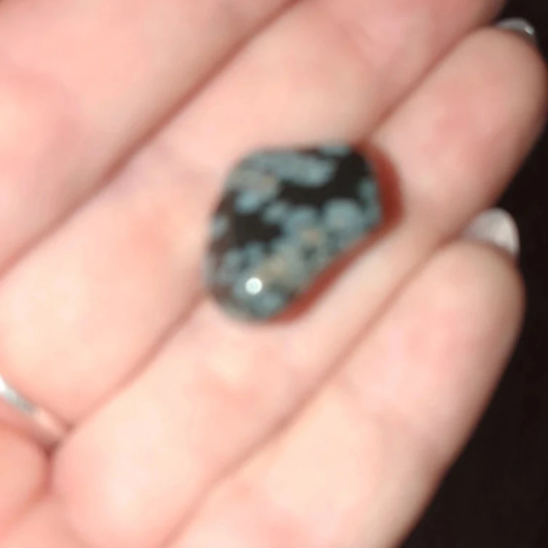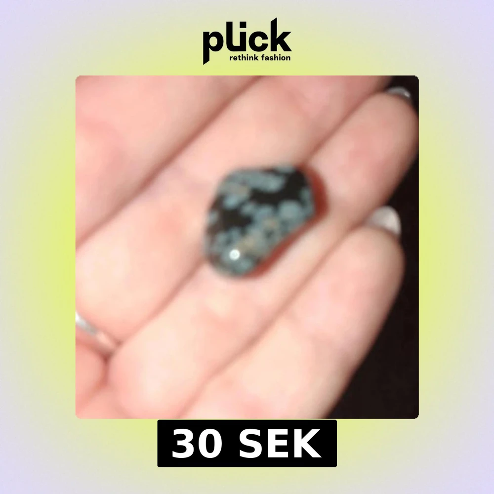 En liten svart sten med grå fläckar, perfekt som dekoration eller för samlingar. Stenen har en slät yta och en oregelbunden form.