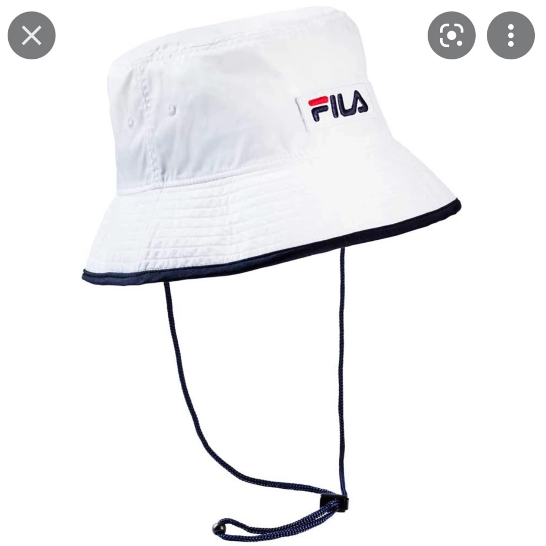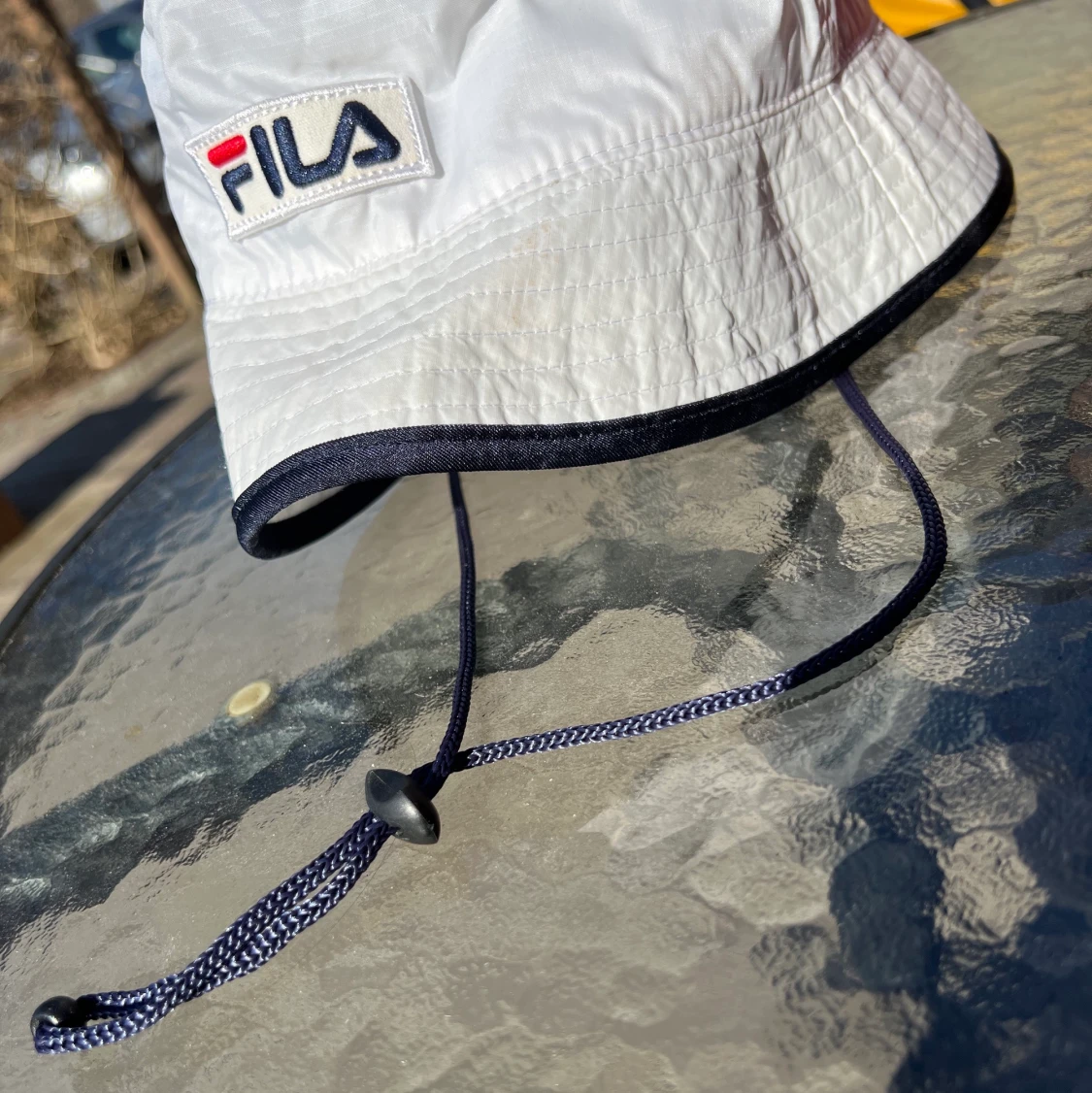 Fila bucket hat i storlek one size. Sitter fast ett snöre i hatten. Gjord av polyester. Köpt från Zalando, och har bara använts vid ett fåtal tillfällen så den är i bra skick.