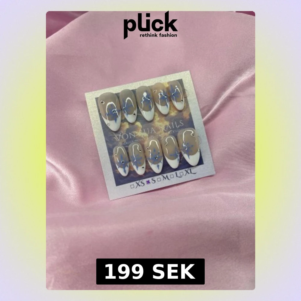 Handgjorda press on-naglar i en medium mandelform med nude bas, vit fransk tipp och blå snöflingor dekorerade med små silverstenar. Snygg och trendig design som verkligen sticker ut. Perfekt för dig som vill ha unika naglar utan att gå till salong.