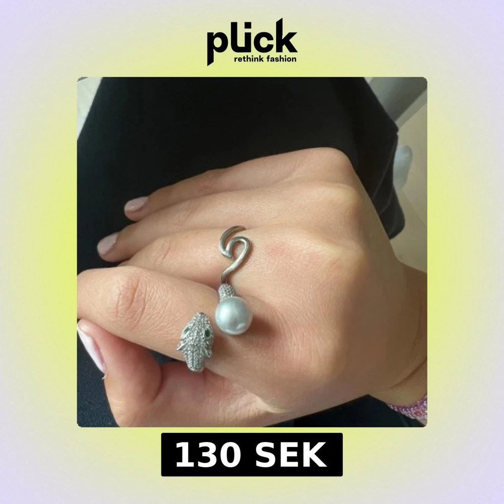 Unik silvrig ring formad som en orm med detaljerat ormansikte och glittrande stenar. Ringen är öppen och pryds av en stor vit pärla på ena sidan. Perfekt statement-piece för dig som gillar djurmotiv och coola accessoarer. Säljer Andvänd 1 gång köpt för 200kr