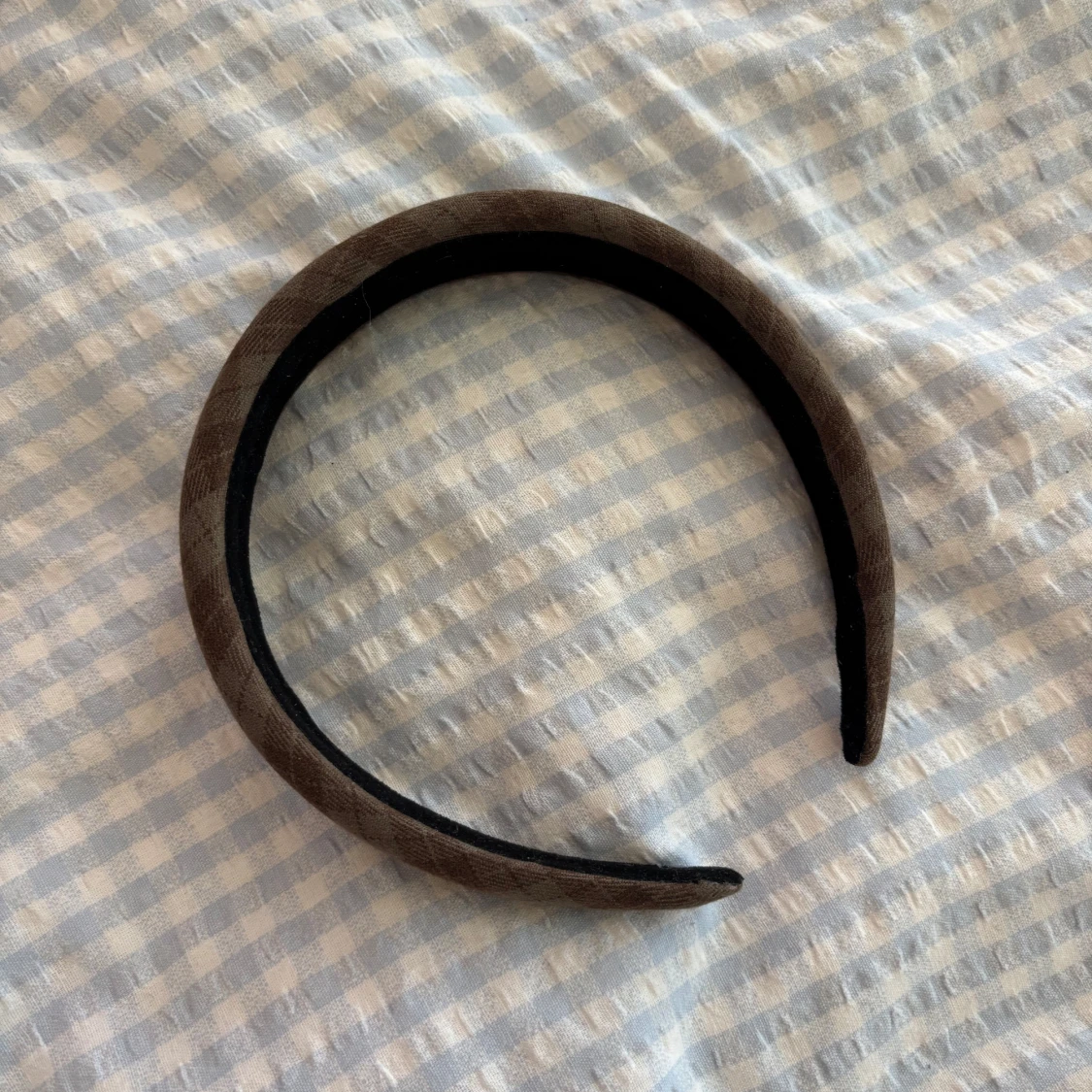 Snyggt diadem i brunt tyg med diskret rutigt mönster. Bred och vadderad modell som sitter bekvämt på huvudet och ger en stilren touch till din look. Perfekt accessoar för att lyfta vilken outfit som helst.