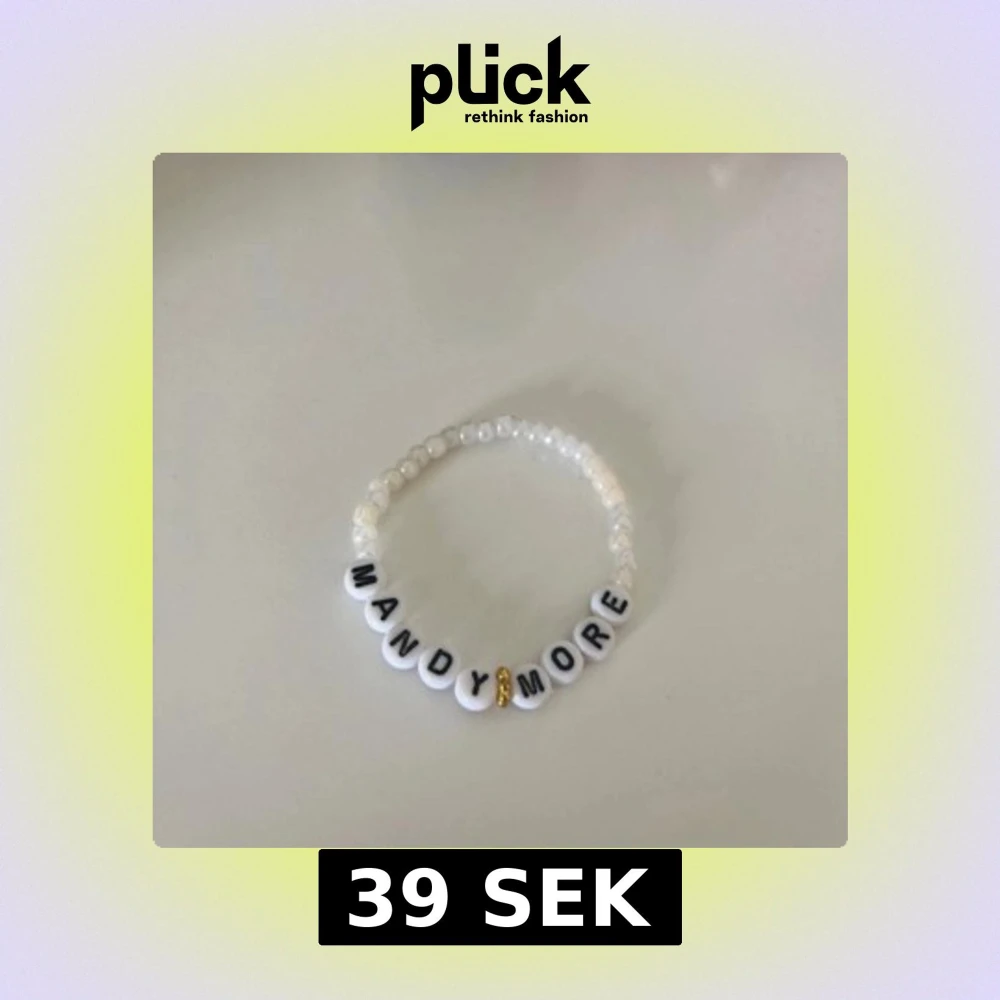 Säljer ett vitt armband med pärlor och bokstavspärlor som stavar 'MANDY MORE'. Armbandet har en liten gulddetalj mellan orden och är elastiskt för enkel användning. Hov1 inspirerat☀️