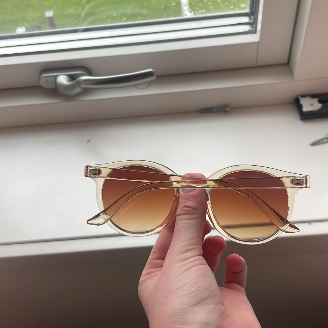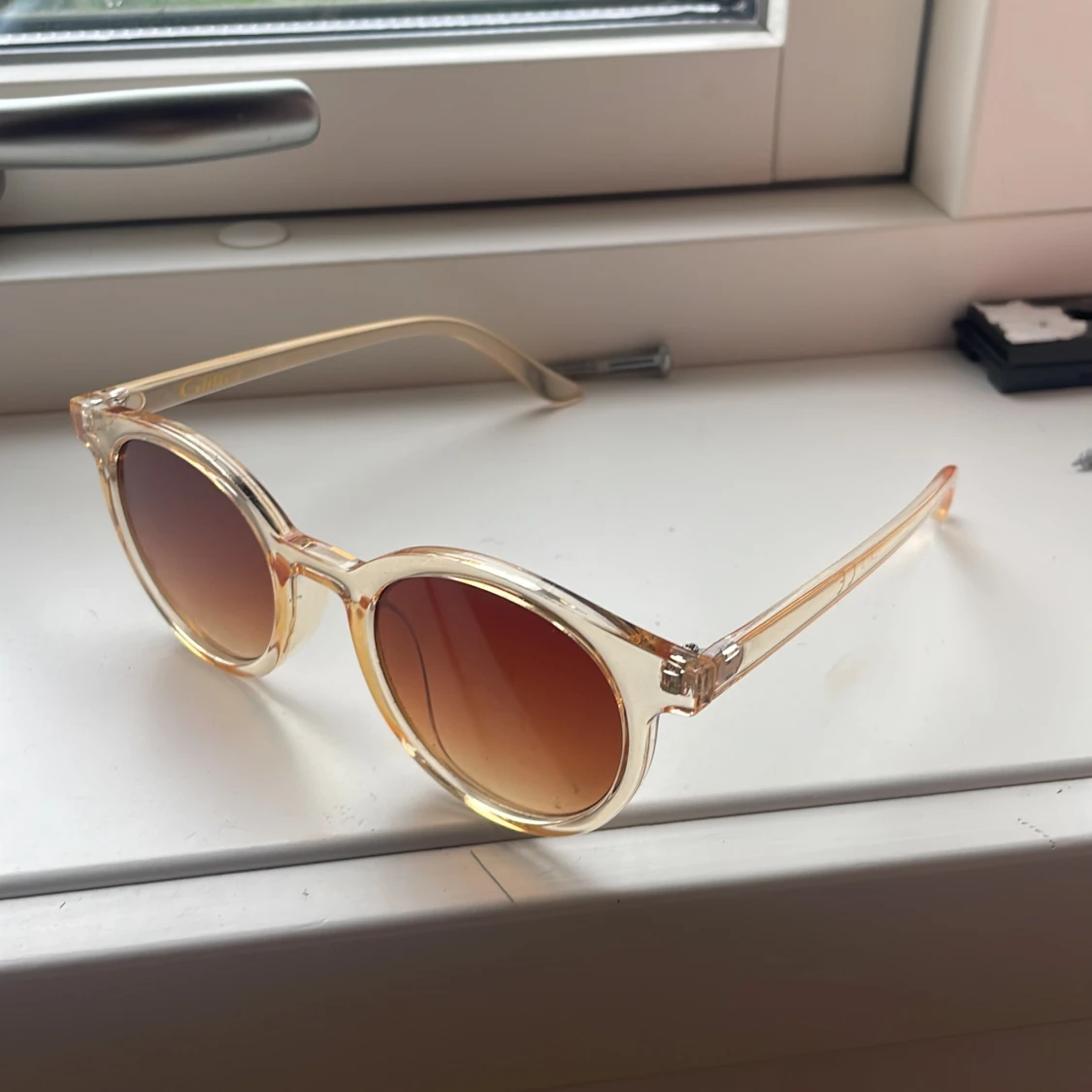 Snygga solglasögon från Glitter med transparent beige plastbåge och bruna tonade glas. Perfekt accessoar för soliga dagar och ger en sommarkänsla som är oslagbar 🌻🌞🍓❤️
