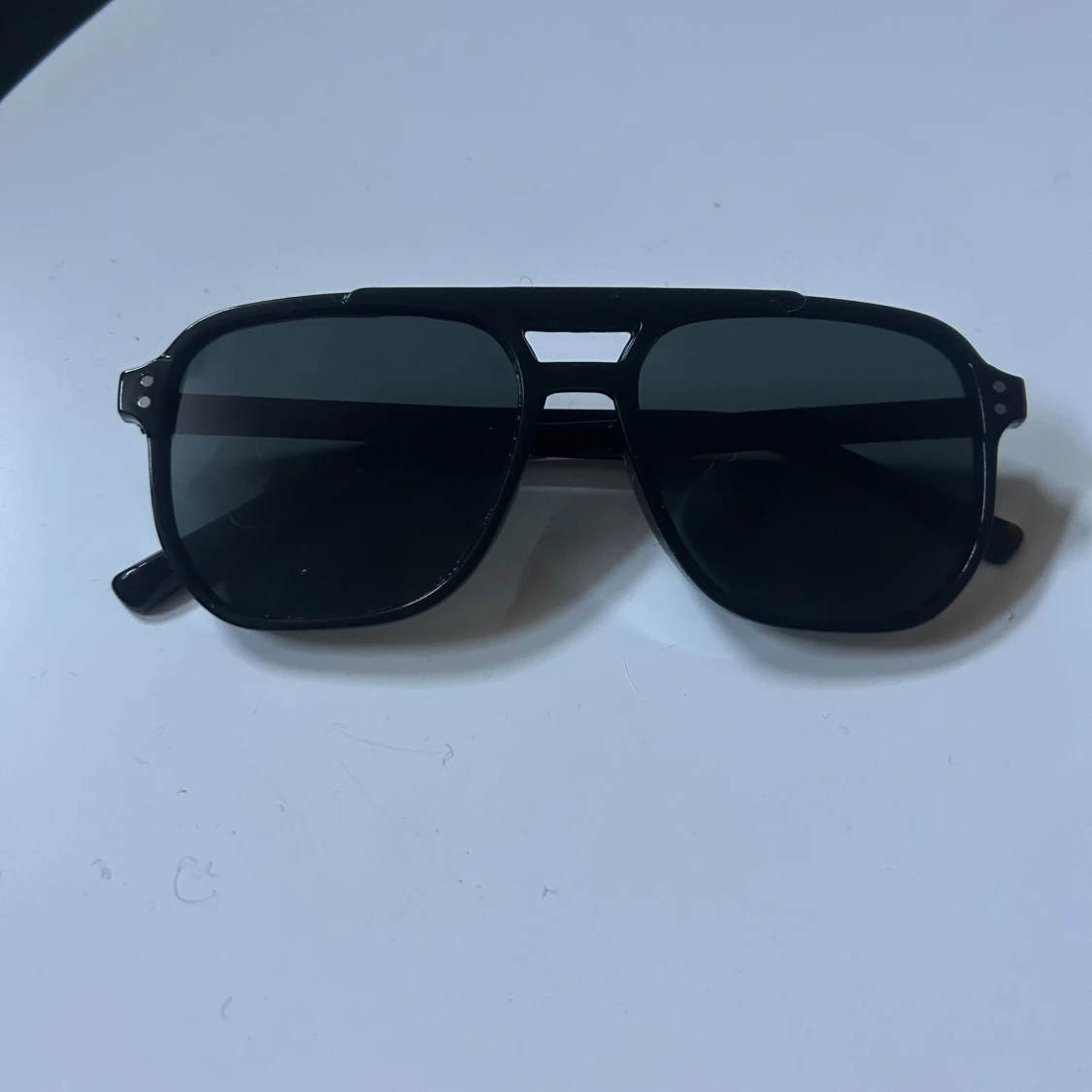 Snygga svarta solglasögon med klassisk pilotform och mörka glas.