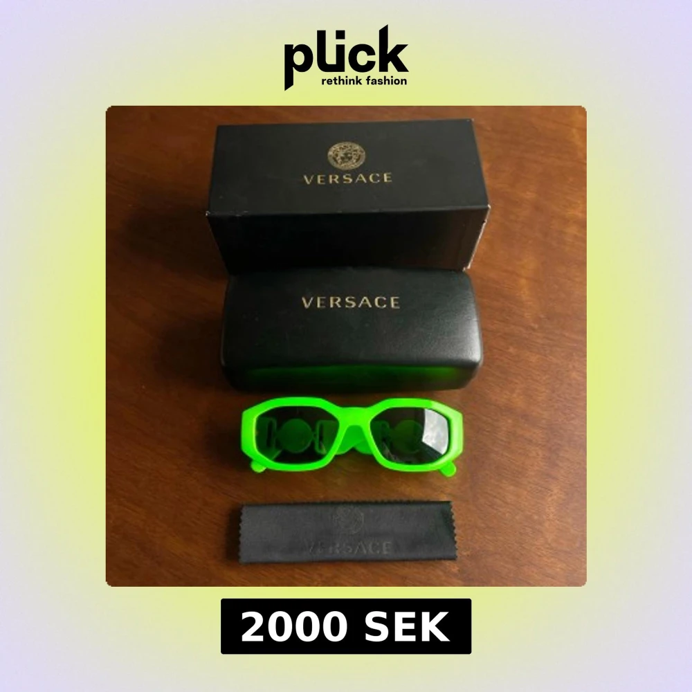 Säljer ett par neongröna solglasögon från det italienska modehuset Versace. De är den älskade modellen 4361 med de ikoniska guldiga Medusa-detaljerna på sidorna. Kommer med originaletui och putsduk. Väldigt sällsynt färg vilket gör det till ett statement-piece. Tips: Perfekt för festivaler i UV-ljus. Helt perfekt skick. Nypris 240eur.