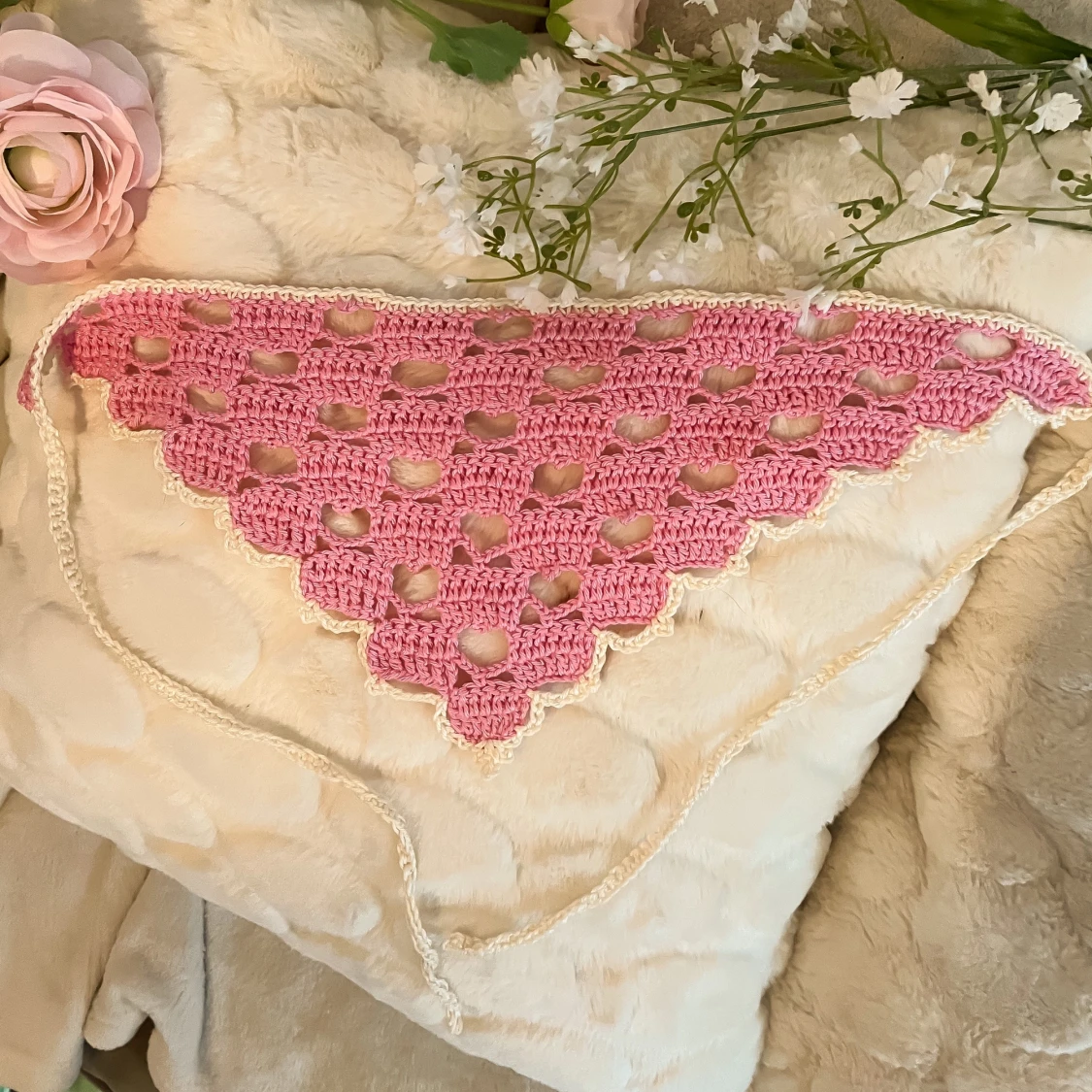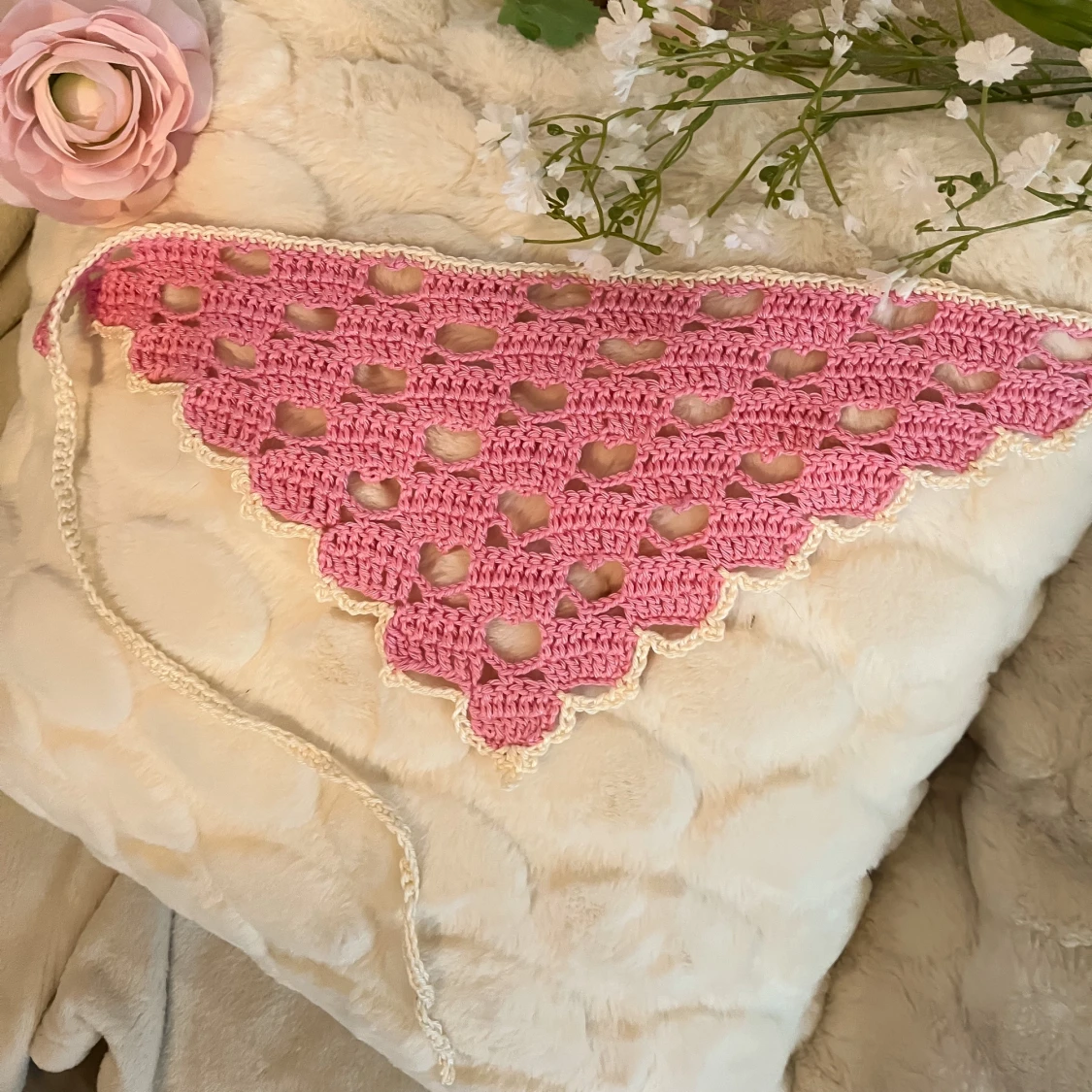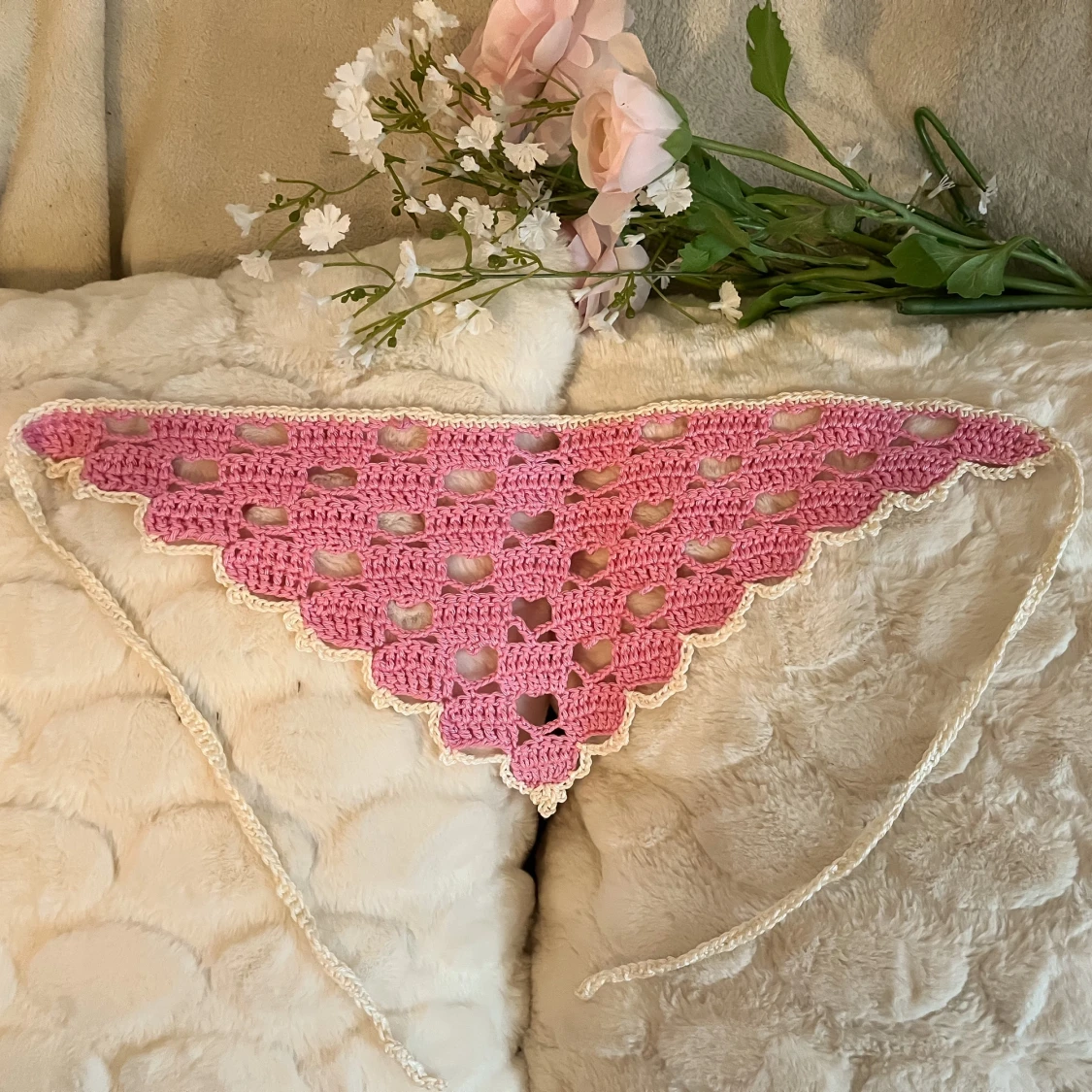 Virkad bandana med hjärtan, rosa/beige💖🌸🤍 Så söt nu i sommar! Knyts i nacken med banden. Jag har virkat den i ett lite lyxigare bomullsgarn som är mercersierat (behandlat för att ge en så fin glans) 🌸🤍 Går även bra att beställa i andra färger