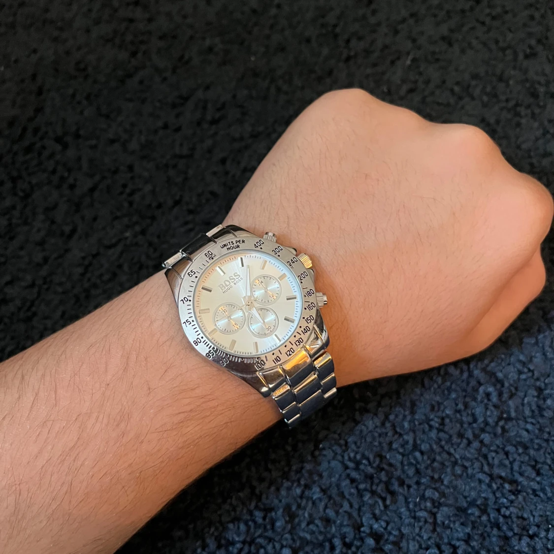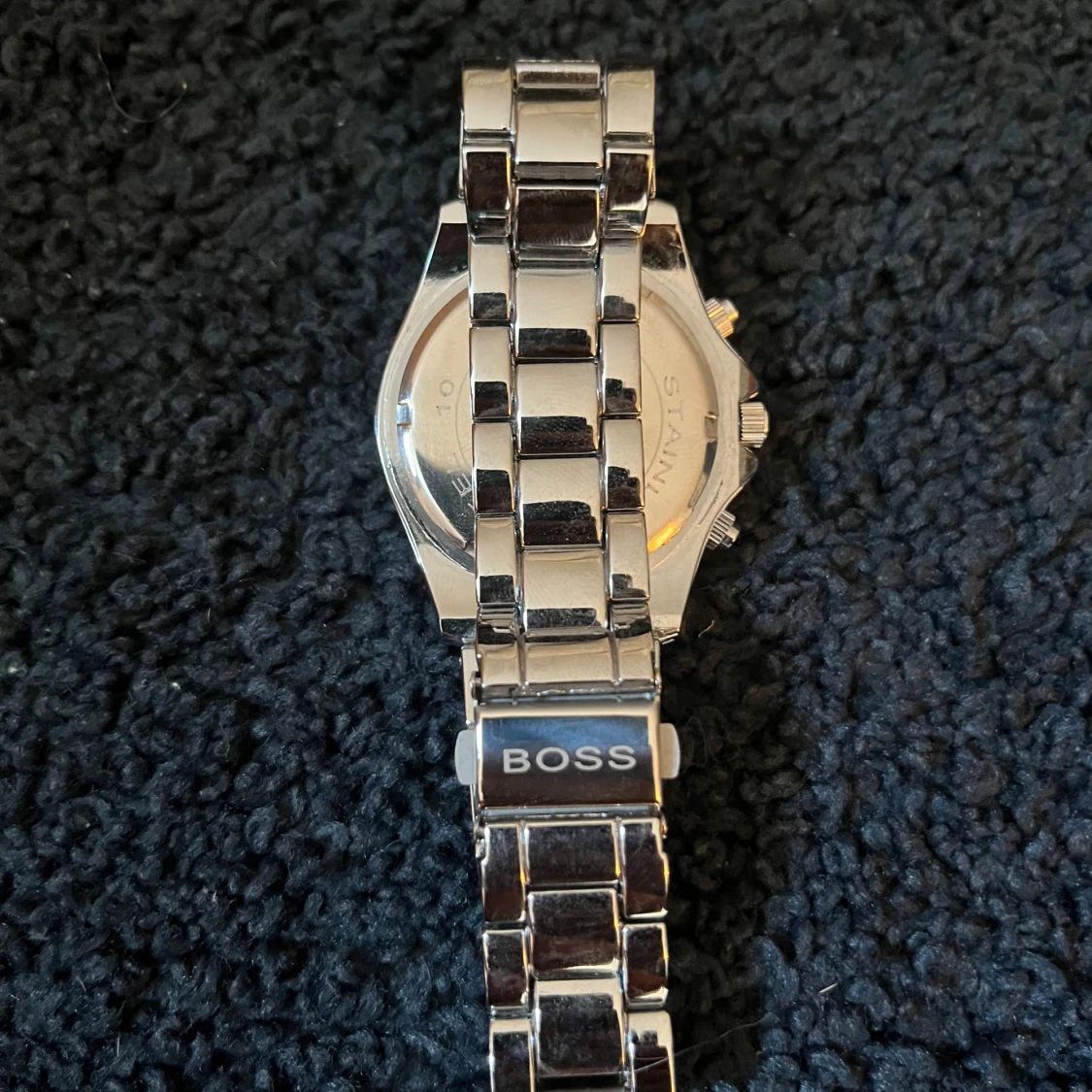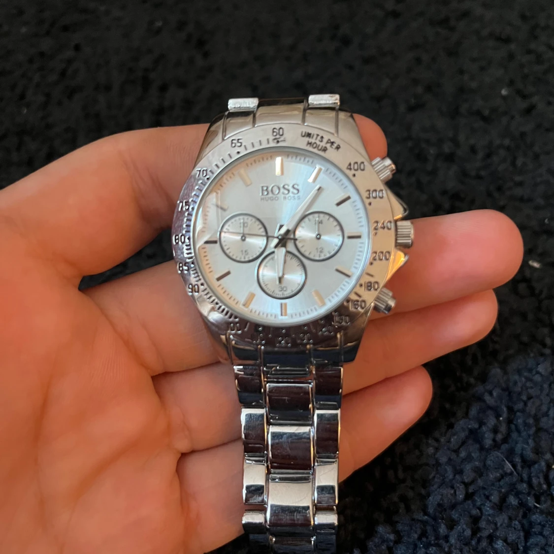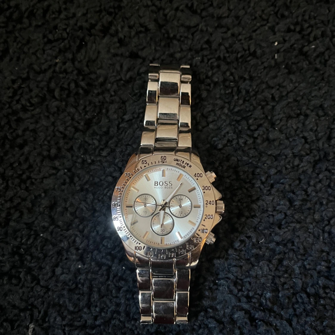 Hör av dig innan du köper! Stilren klocka från BOSS i silverfärgat rostfritt stål med länkarmband. Urtavlan är också silverfärgad med tre mindre visartavlor och tydliga markeringar. Klockan har en sportig och elegant design med BOSS-logga på både urtavla och spänne.