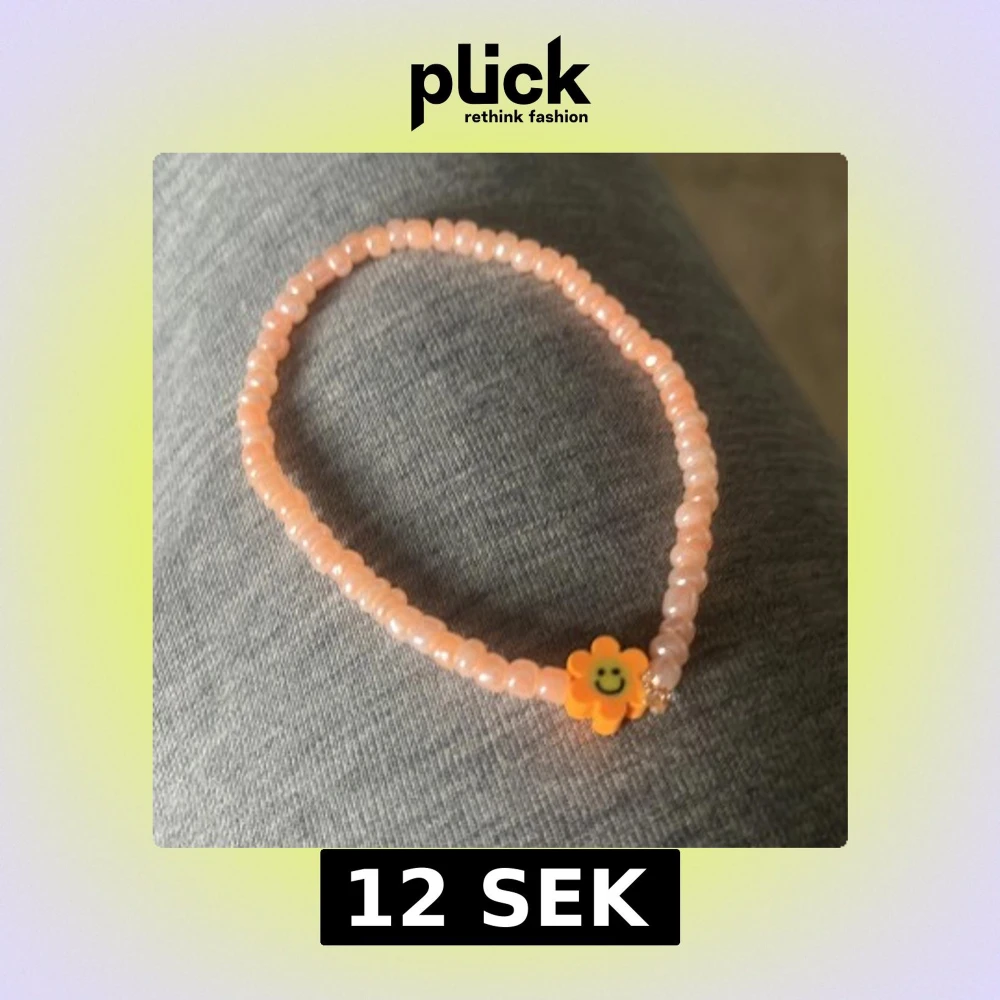 Sött armband med små rosa pärlor och en gul blomma med smiley. Perfekt accessoar för att liva upp din outfit med en lekfull detalj.