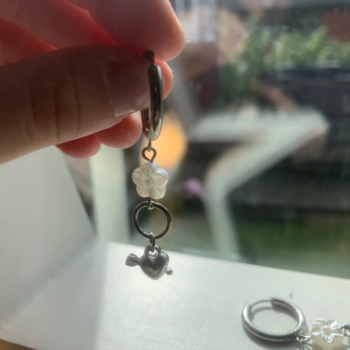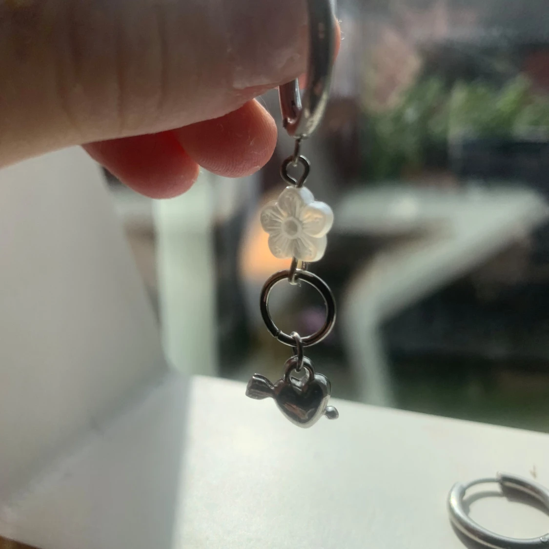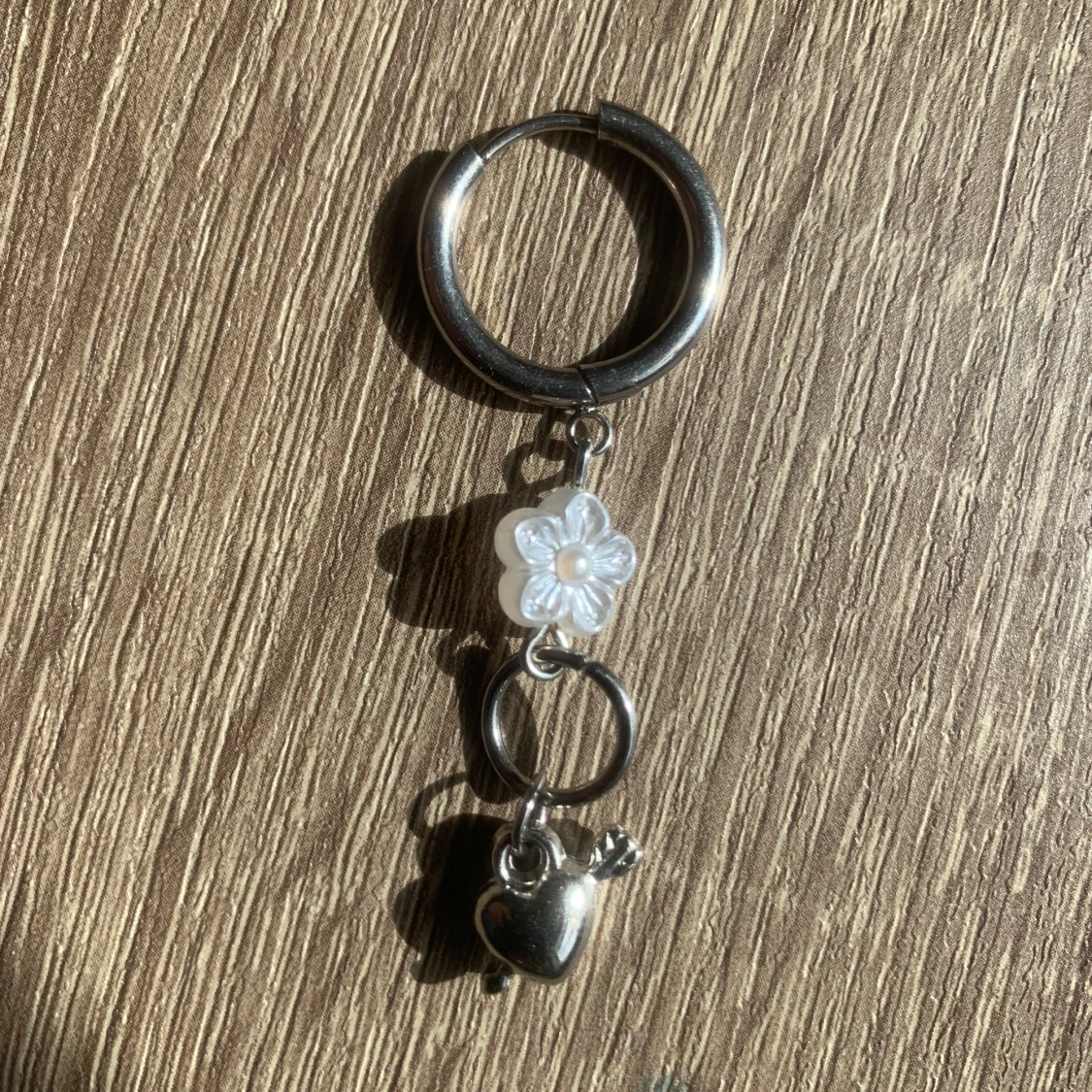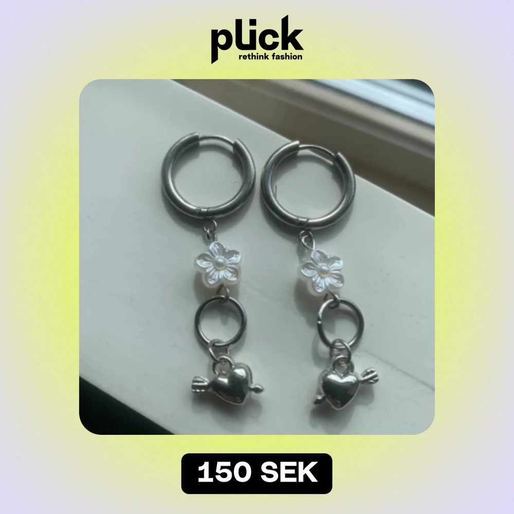 Ett par silverörhänge, varje örhänge har en vit blomma och ett silverfärgat hjärta med en pil genom det. pris går att diskutera vid snabb affär💕