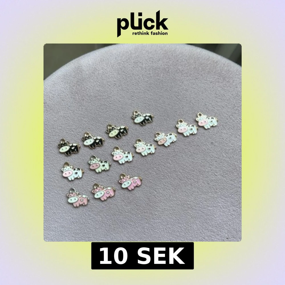 Samling med gulliga berlocker i form av små kor i olika färger: svart, vit och rosa. Perfekta att använda till halsband, armband eller örhängen. Berlockerna har detaljer i guld och emalj, och några har en 3D-form med orange mule. Skapa egna smycken med dessa unika och charmiga motiv!
