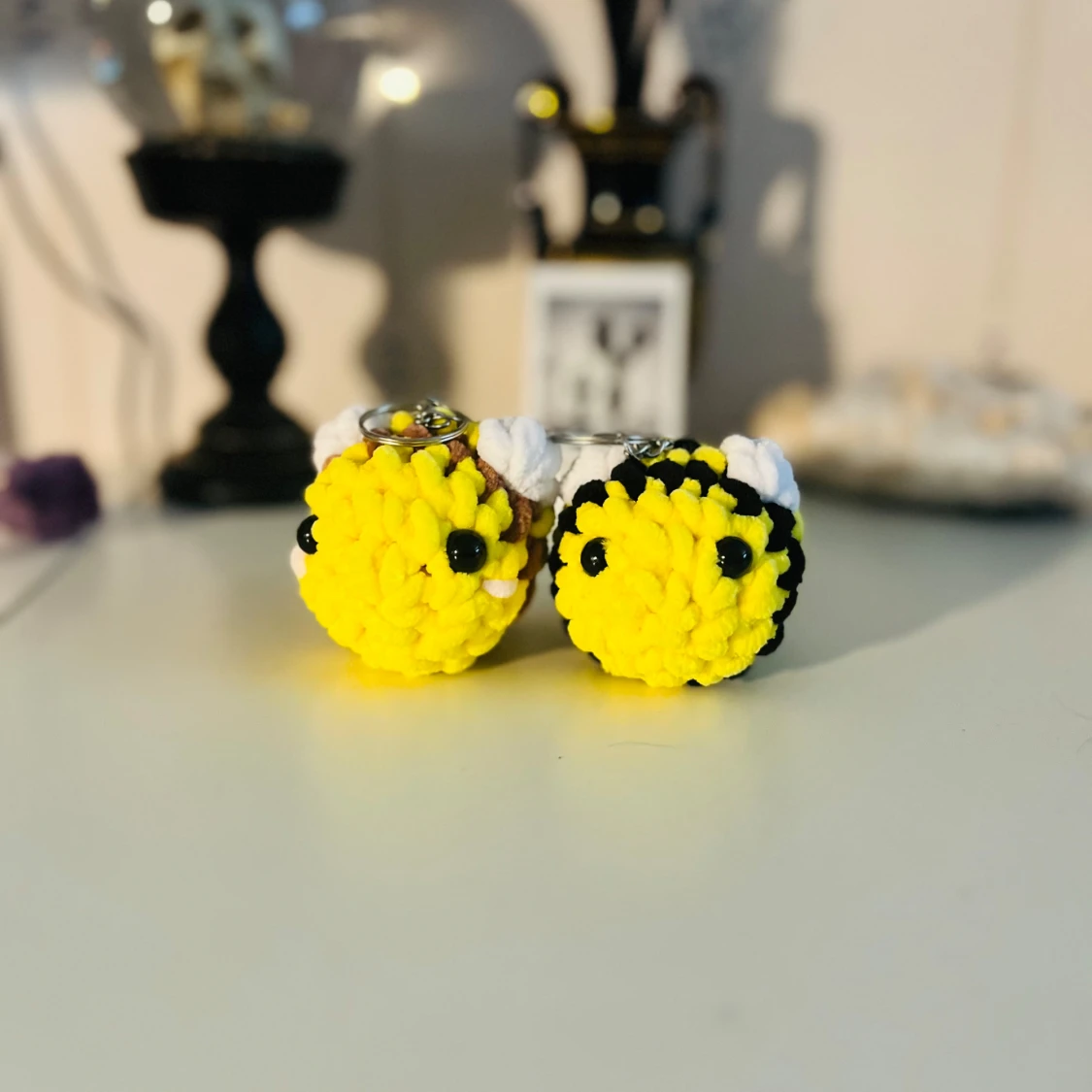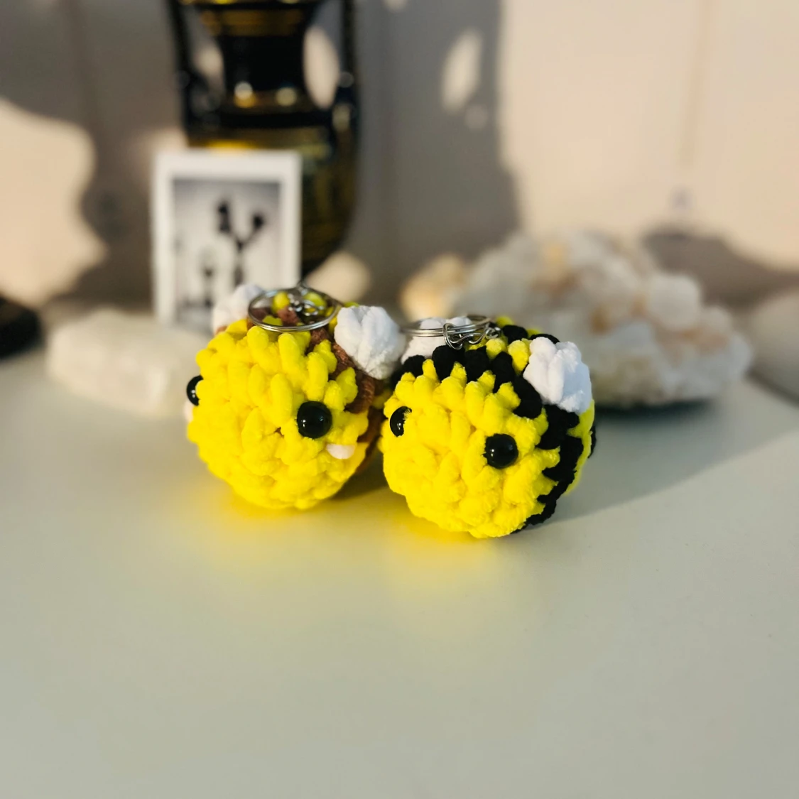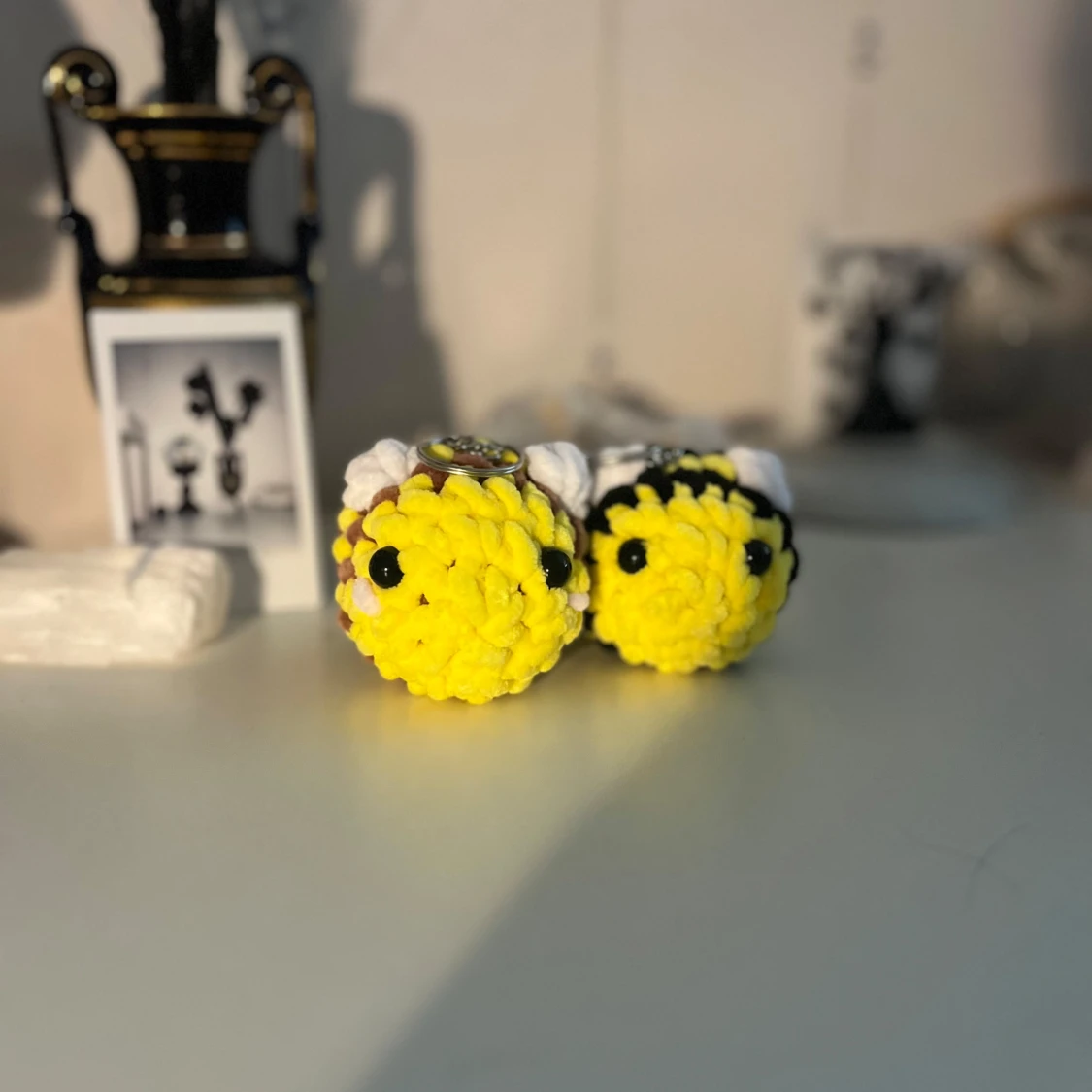 Säljer två supergulliga nyckelringar som ser ut som små bin! De är fluffiga och har en härlig gul färg med svarta ränder. Perfekta att hänga på väskan eller nyckelknippan för en söt touch. 🐝