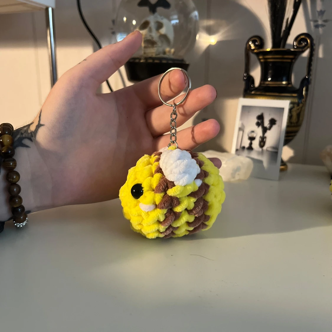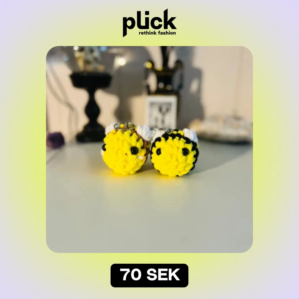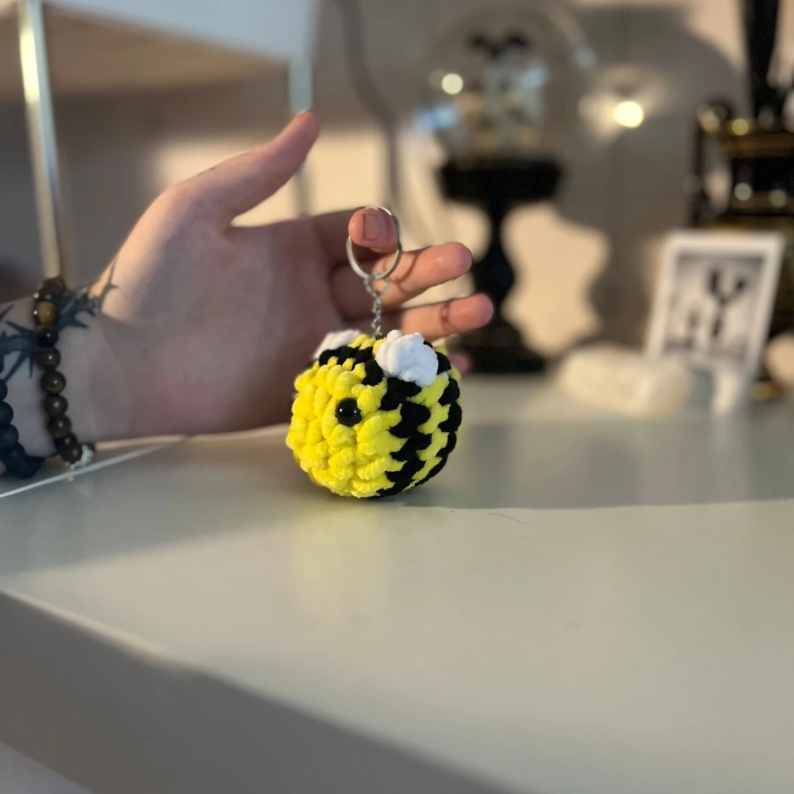 Säljer två supergulliga nyckelringar som ser ut som små bin! De är fluffiga och har en härlig gul färg med svarta ränder. Perfekta att hänga på väskan eller nyckelknippan för en söt touch. 🐝