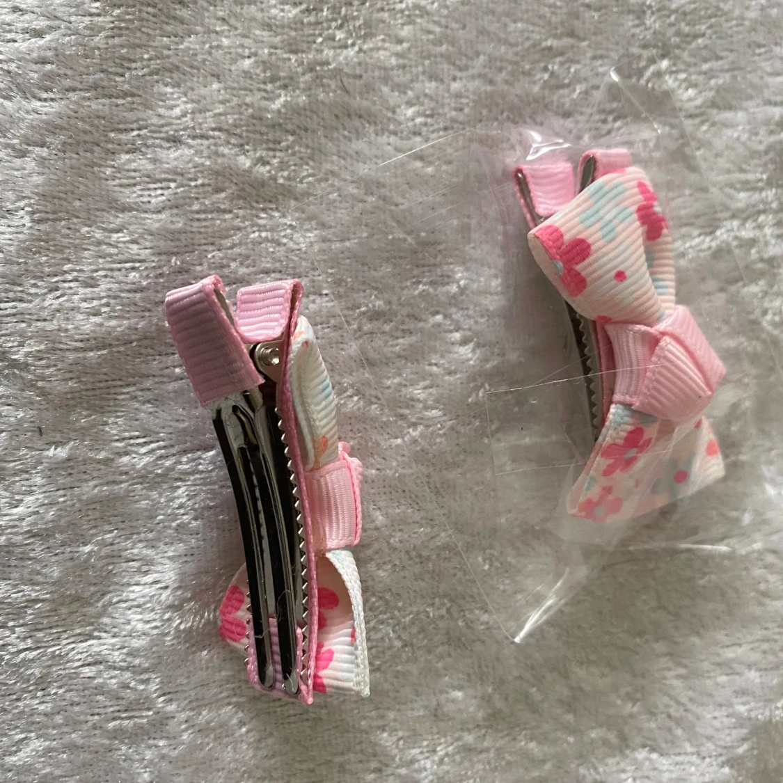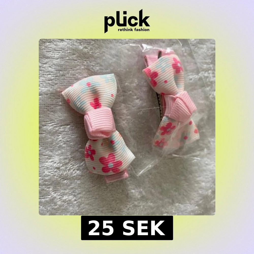 Två par hårspännen med rosetter i pastellrosa nyanser. Ena paret har blommigt mönster i rosa och blått, andra paret har jordgubbsmotiv och prickar. Båda är gjorda i ribbad polyester och fästs med metallklämma. Perfekt för att piffa upp frisyren. Pris 25kr/par / bild , samma frakt