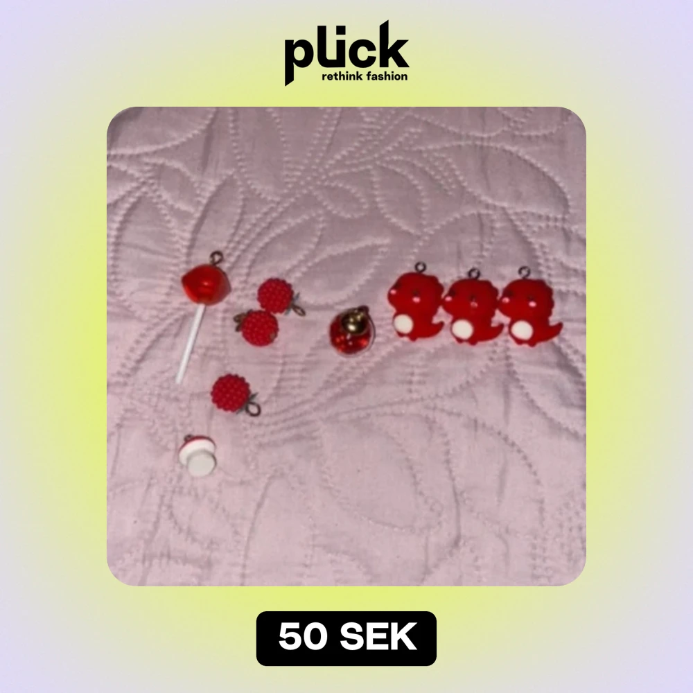 Ett set med olika röda smycken, inklusive örhängen och berlocker. Det finns ett par örhängen som ser ut som röda klubbor, ett par med röda bär och några små röda figurer. Perfekt för att lägga till en lekfull touch till din outfit!
