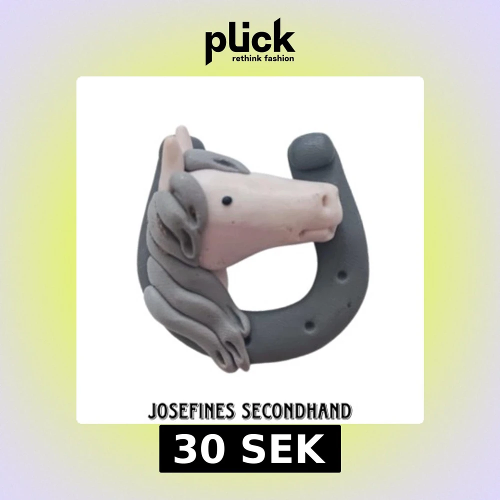 Handgjord brosch av lera i form av en häst och hästsko. Köpt secondhand. Är i fint skick. Skickas med brev, frakt 15 kr. Frii frakt vid köp av 3 eller fler smycken/smink prylar