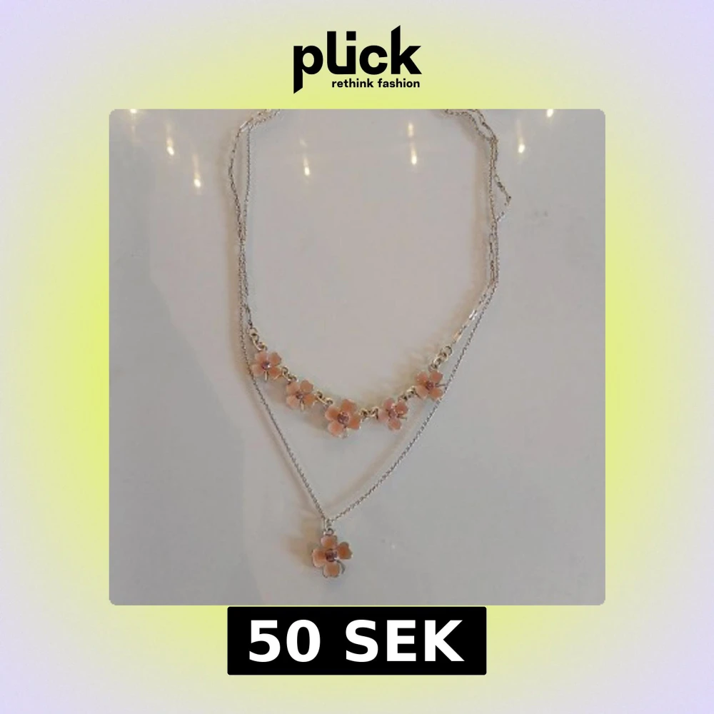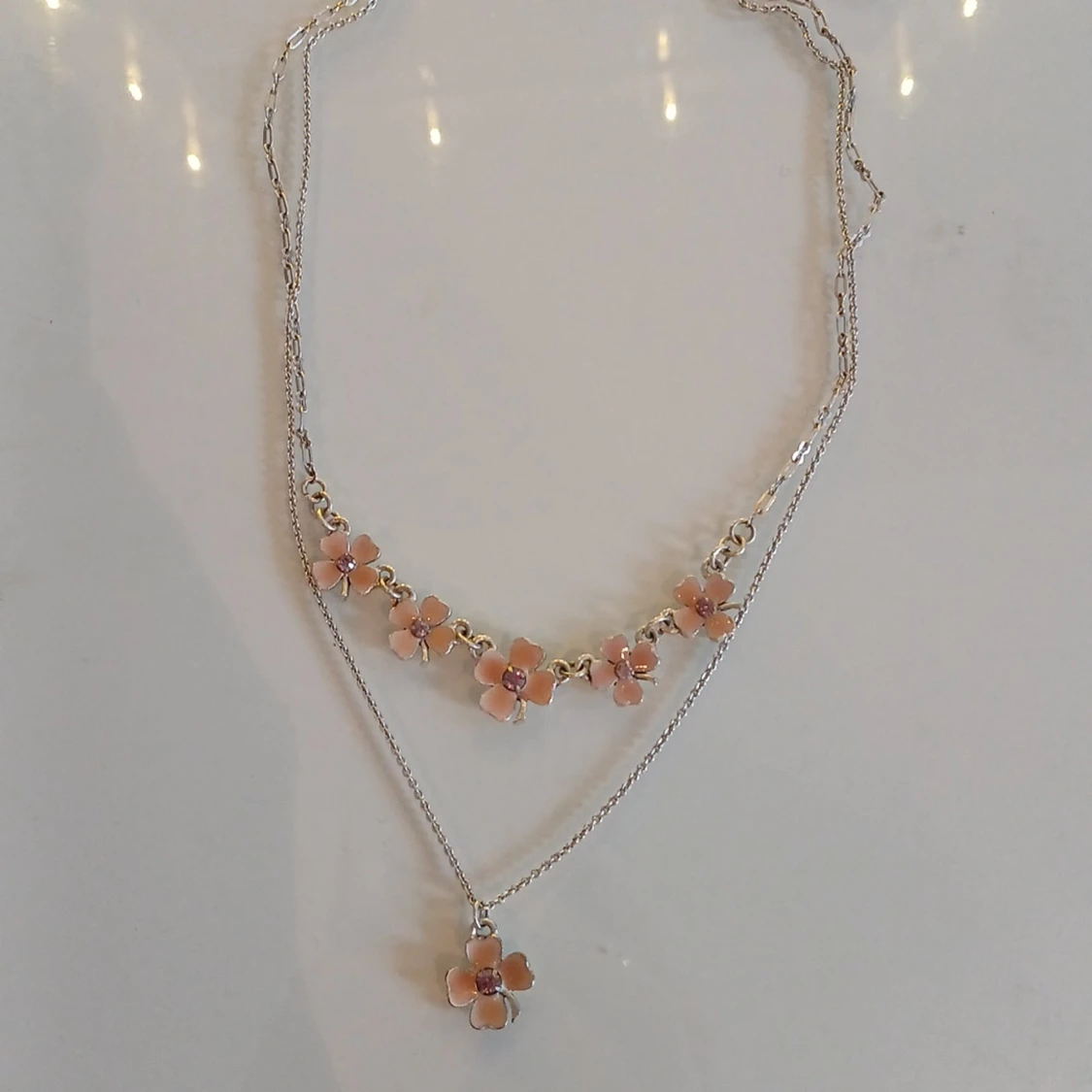 Sött , silvrigt halsband med små rosa blommor. Halsbandet är dubbetkedjat.