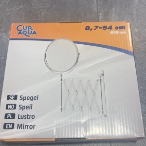 Säljer denna spegel, vrid och vinklingar dubbelsidig med förstorningsfunktion förkromat stål. Skruv och glugg ingår. Kolla på bilden om du vill se hur lång den är.