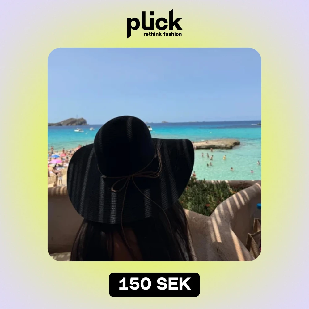 En elegant svart solhatt med bred brätte, perfekt för soliga dagar på stranden. Hatten har en dekorativ snörning runt basen av kullen med snäckor!