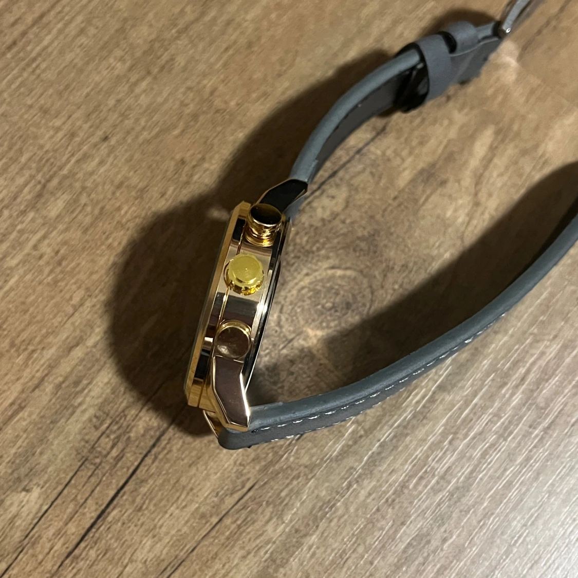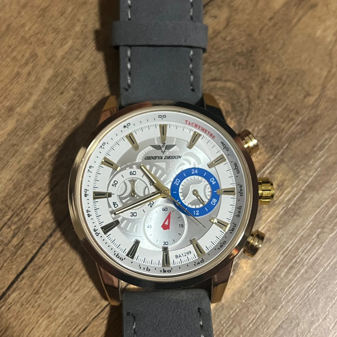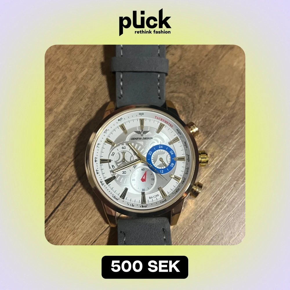 Säljer en stilren klocka från CURREN Design med ett grått läderarmband och guldiga detaljer. Urtavlan är vit med blå och röda accenter, vilket ger en modern touch. Perfekt för både vardag och fest! 🕒✨
