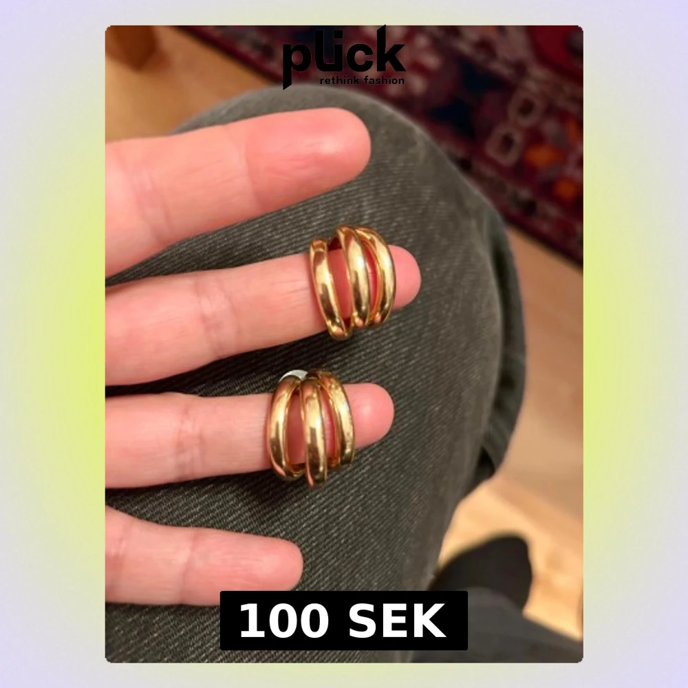 Säljer ett par örhängen i stål guldton med tredelad, rundad form. De har en cool look och sitter snyggt på örat. Perfekt för dig som gillar att sticka ut med accessoarer. Ingen märkning syns på bilderna.