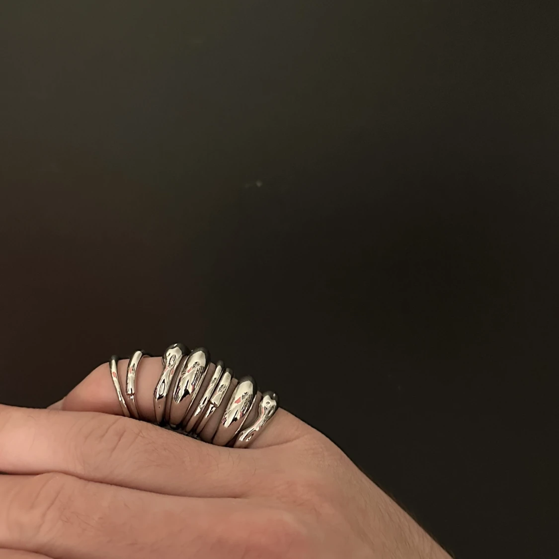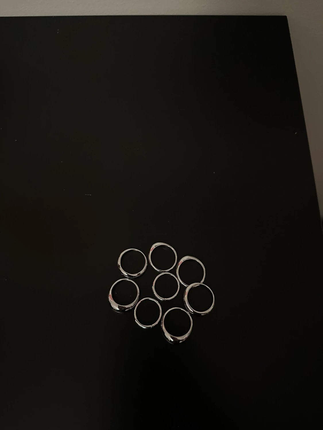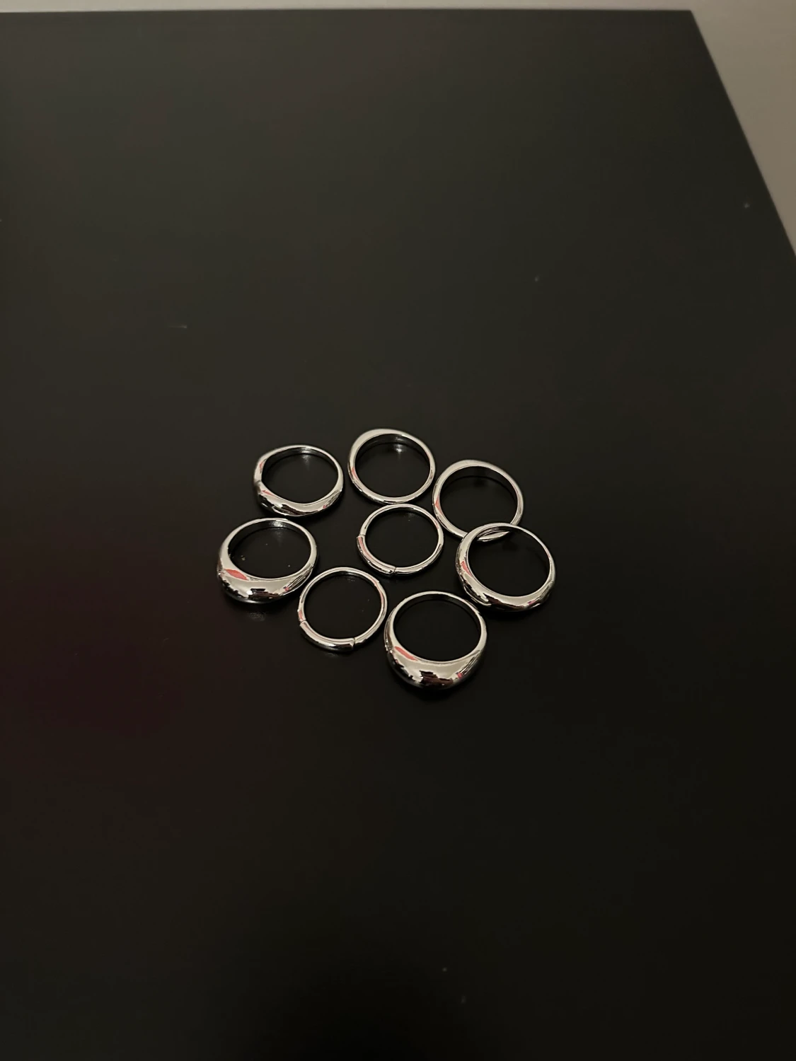 Fina silvriga ringar som man kan ”stapla”. Superfina i legerat stål. Storlekar ca 7-8 ring size (standard size). Fina smycken som passar t allt