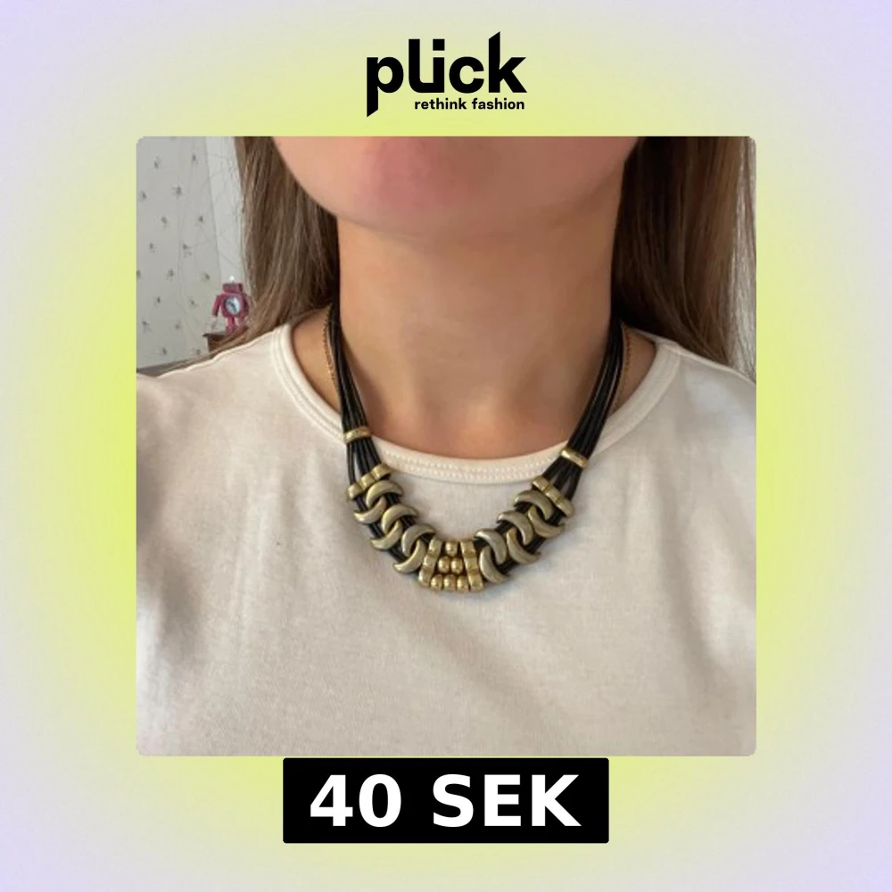 Säljer ett statement halsband med flera svarta läderremmar och stora guldfärgade metall-detaljer. Halsbandet har en cool, chunky design med böjda länkar och pärlliknande detaljer framtill. Perfekt för att lyfta vilken outfit som helst.