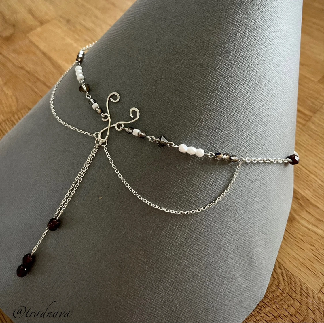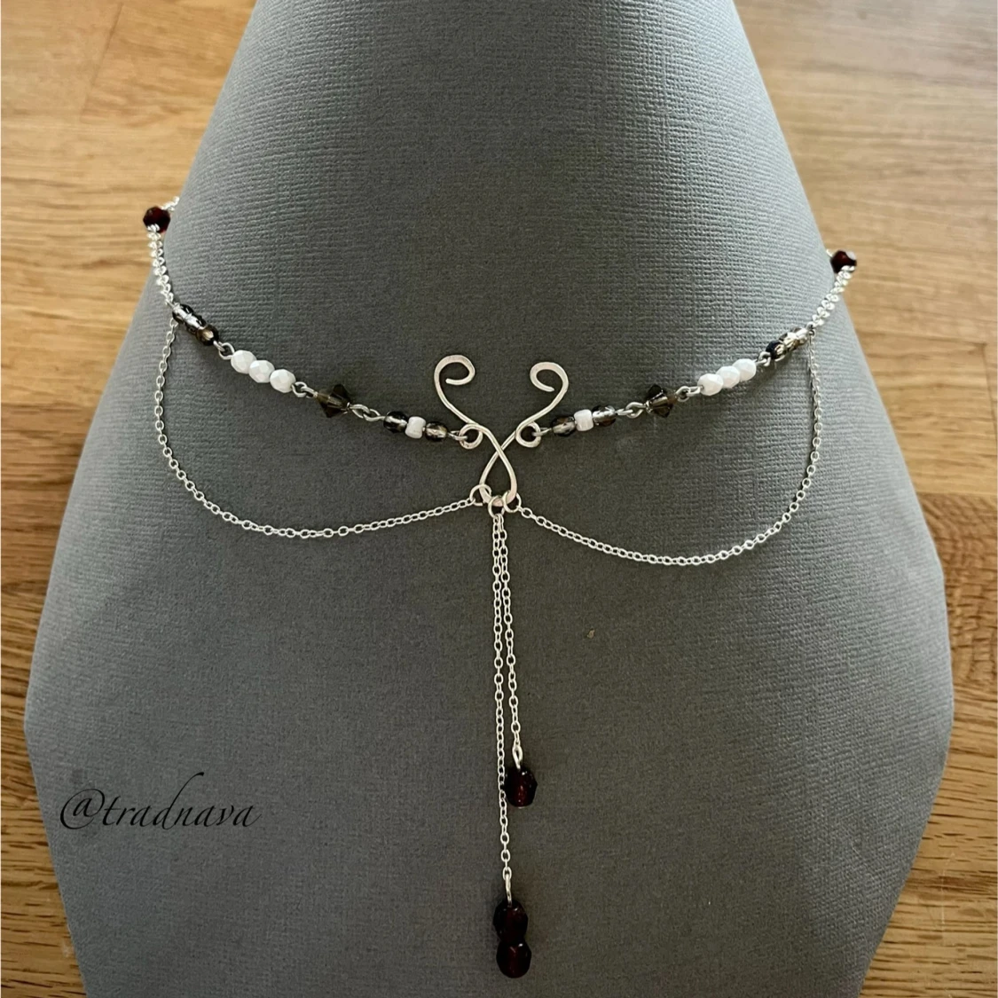 Handgjort halsband med länkar och kedjor i silverpläterad koppar och mässing. Centralsmycket är gjort i non-tarnishbehandlad koppartråd. Smycket pryds av tjeckiska firepolish och glaspärlor från Par Puca🤍