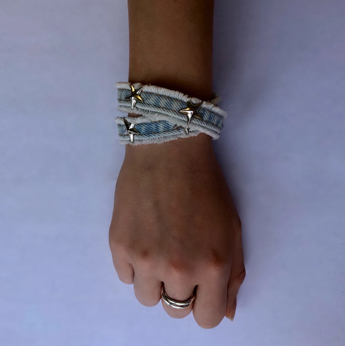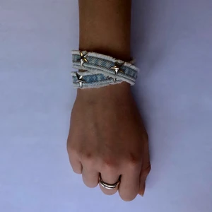 Doublestrap armand i ljusblått jeansmaterial med stjärnor på💙 Armbandet är 36,5 cm i omkrets (2/2 SÅLT men kan göra fler på beställning)
