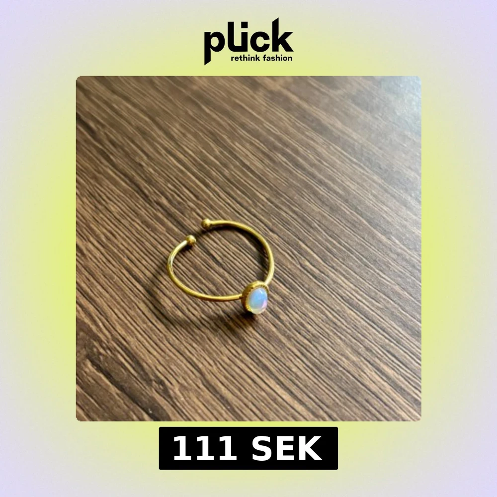 Snygg guldfärgad ring med tunn, öppen design och en oval, skimrande opalsten i vitt och blått. Ringen har små detaljer runt stenen som ger en exklusiv känsla. Perfekt för dig som gillar stilrena smycken med en twist.