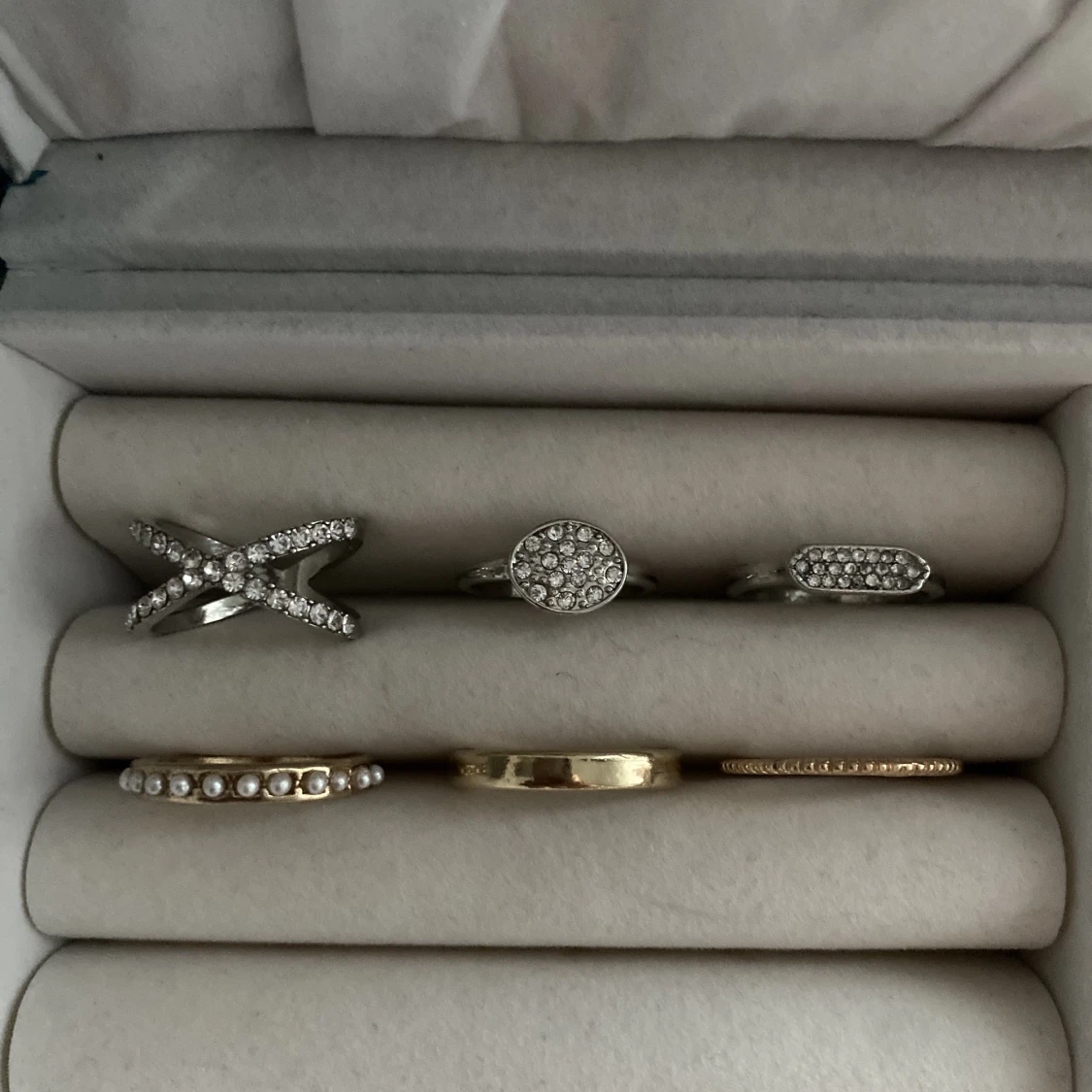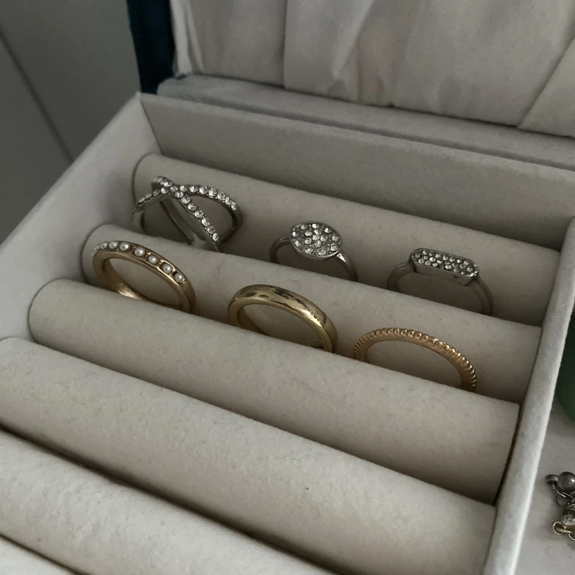 Olika ringar från olika märken. H&M, SHEIN, Ur&Penn. 6 ringar för 60 kr, 3 för 40 kr och 1 för 15 kr. Om ni inte vill köpa alla 6 får ni höra av er.