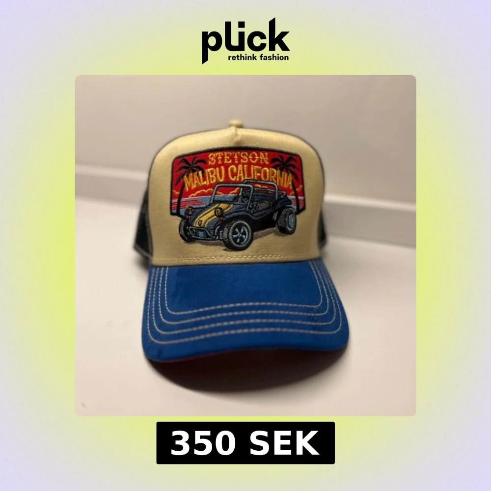 Snygg keps från Stetson med broderad design av en bil och texten 'Malibu California'. Kepsen har en beige front och blå skärm, med svart mesh på baksidan för ventilation. Perfekt för en avslappnad stil. Nypris 600kr