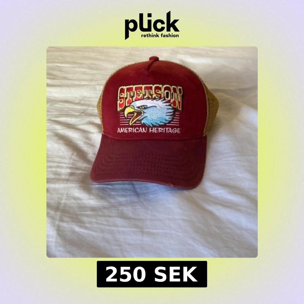 Säljer en snygg truckerkeps från Stetson med röd front och beige mesh baktill. Framsidan har broderad örn och texten 'STETSON American Heritage' i gult, vitt och rött. Justerbar snapback och klassisk böjd skärm. Perfekt för dig som gillar retrostil och statement-plagg.köpte för 500 är ändvänd i 2 månader så säljer för halva pris och kan sänka