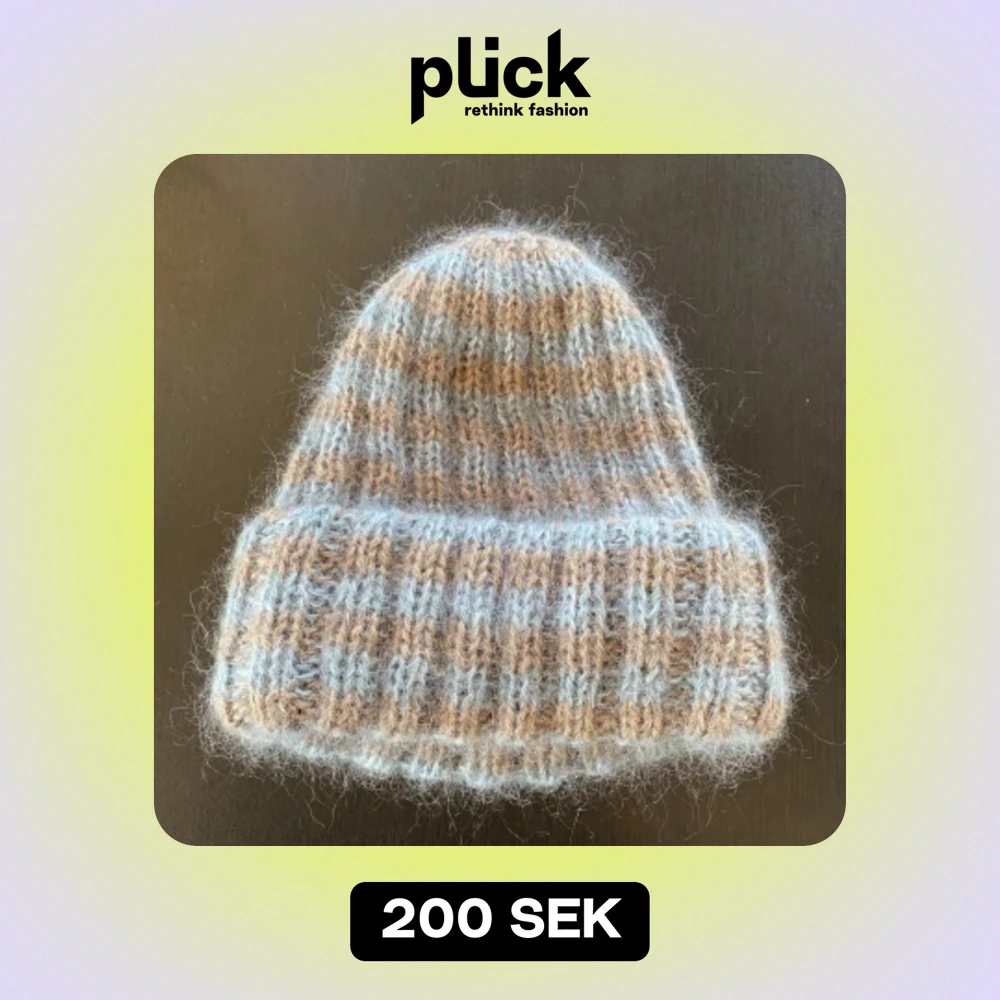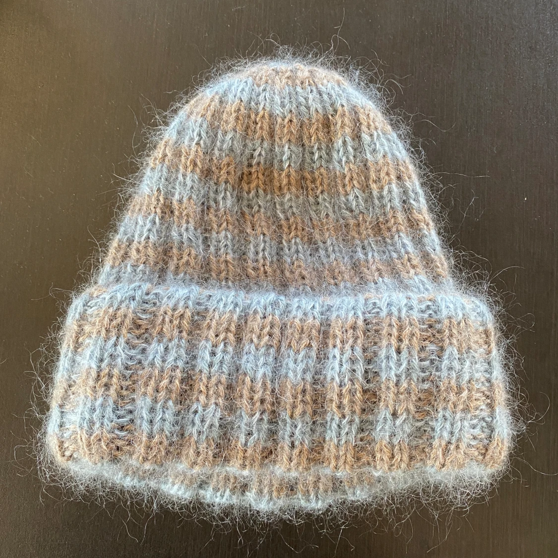 Blå och brun randig hemma stickad mössa. Garn: 100% alpacka garn + 75% mohair, 25% silke garn.