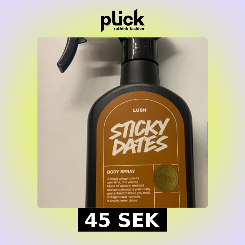 Säljer 5 ml av Lush sjukt goda Sticky Dates Body Spray med en helt underbar sirapsöt doft av karamell, benzoeharts, sandelträ, doftar som créme brûlée, butterscotch, hot bakery! Höstens hetaste doft!😋👌Passar dig som gillar söta dofter. Lilla flaskan är i glas och har en praktisk sprayfunktion och kan tas med överallt👌 Har även Yog Nog, Yuzu and Cocoa och Let the good times roll🧁🍪🥮🍮🍫👌Skickar snabbt💌