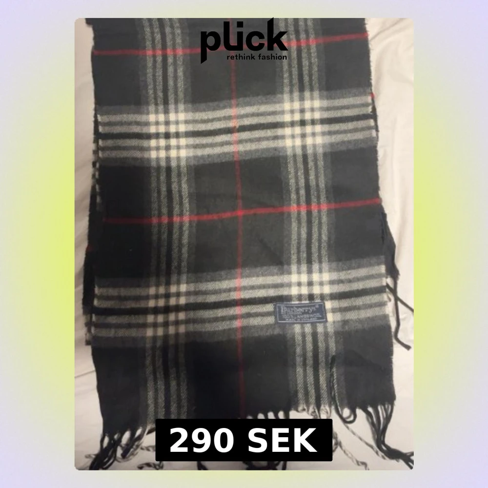 Säljer en klassisk rutig scarf från Burberry i 100% lammull. Scarfen har svart, vit och grå bas med röda detaljer och fransar nedtill. Perfekt för dig som vill ha en tidlös och snygg look med brittisk känsla.