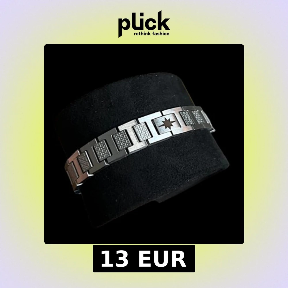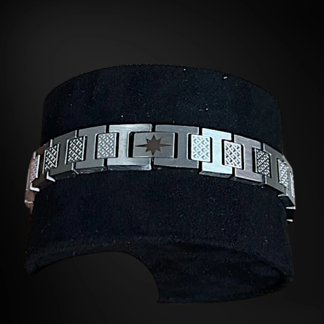Snyggt länkarmband i silverfärgad metall med rektangulära länkar och graverade mönster. En av länkarna har en stjärnformad detalj som ger armbandet en unik touch. Perfekt för dig som gillar stilrena accessoarer med lite edge.