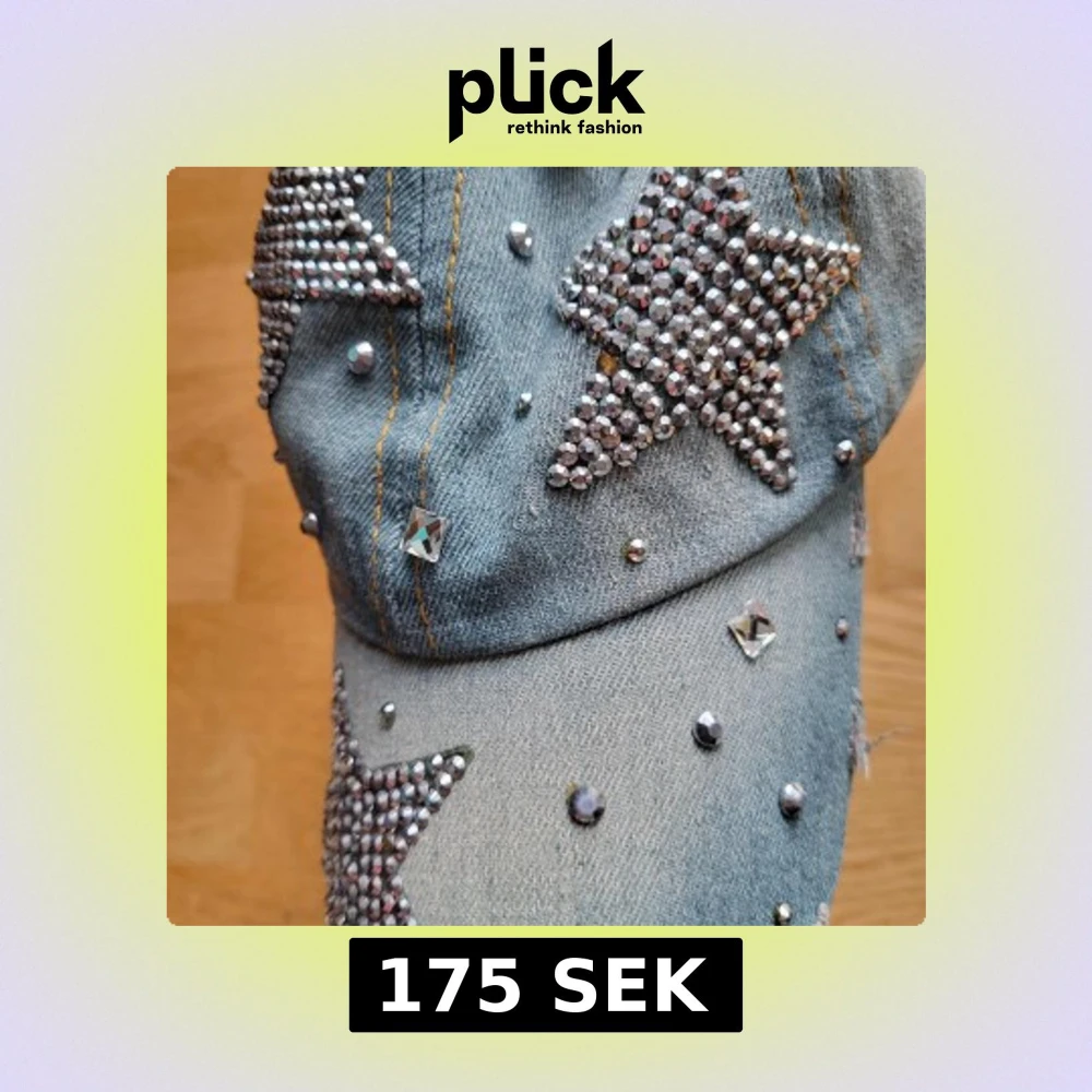 Cool keps i ljusblå denim med stora glittrande stjärnor. Kepsen har justerbart spänne bak och kontrastsömmar i gult. Skriv vid frågor!😍