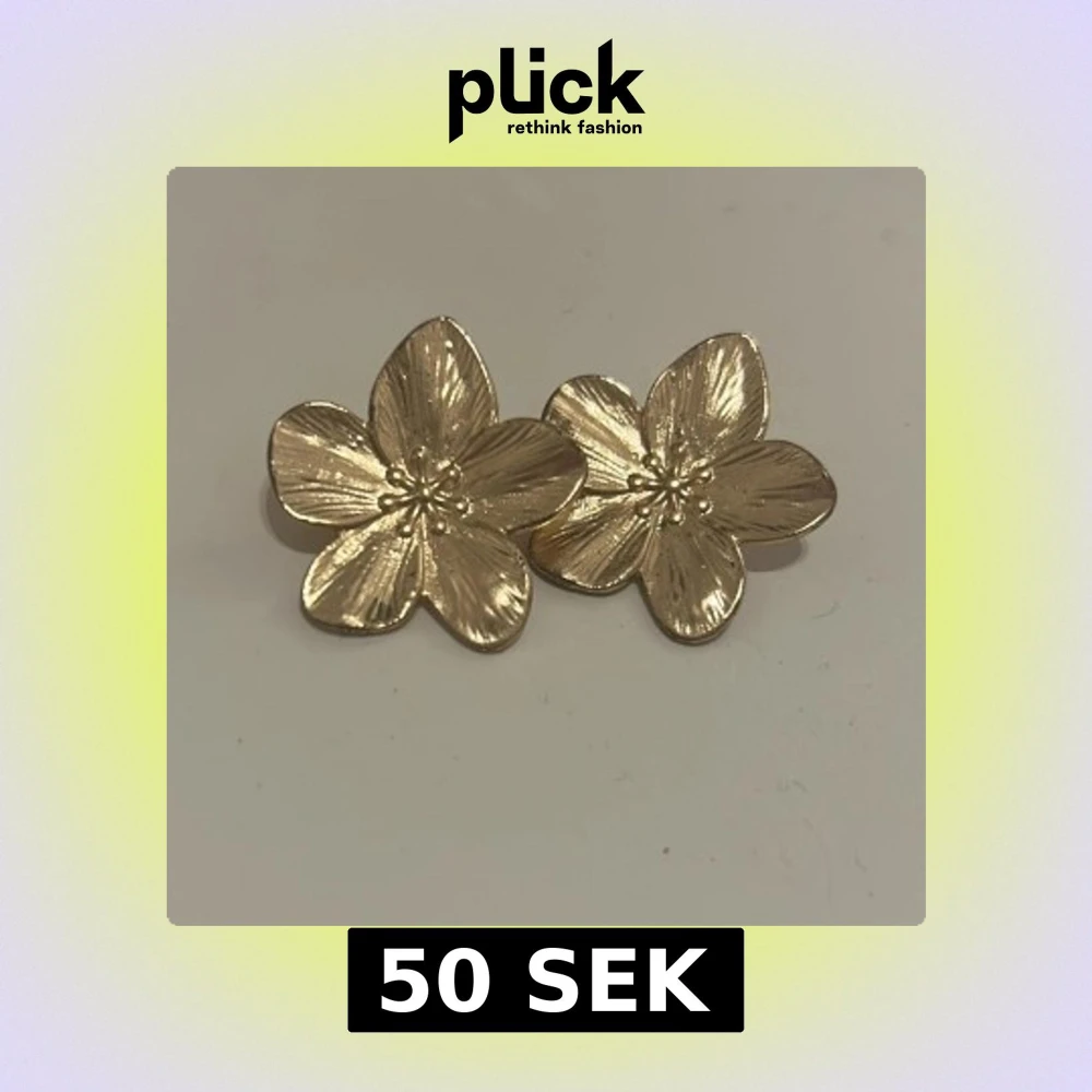 Snygga örhängen i form av stora blommor i guldig färg. De har fem kronblad med fina detaljer och en glansig finish. Perfekta för dig som vill ha ett statement-smycke med blommig vibe. Det är någon liten slitning på framsidan om man kollar noga, som man ser på första bilden