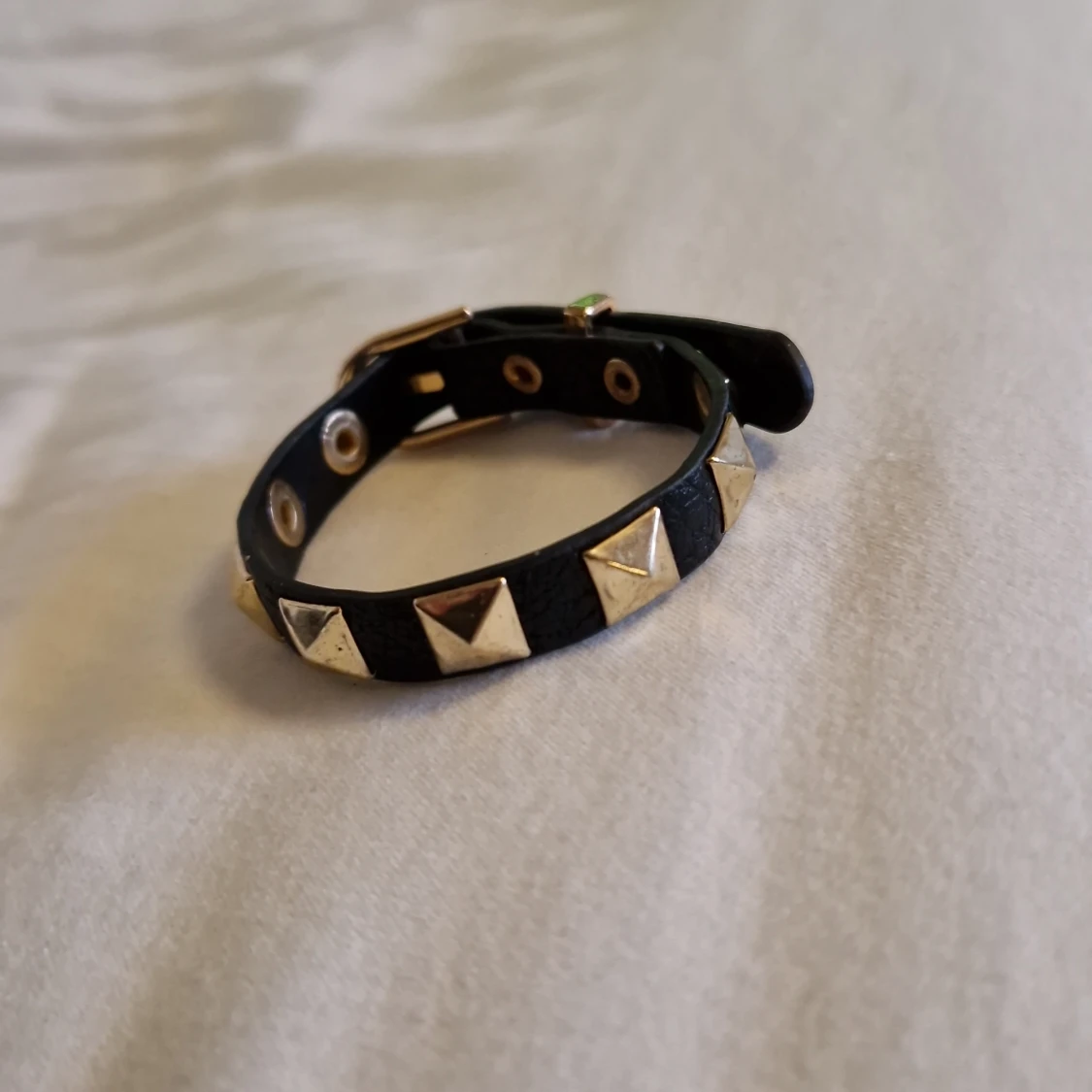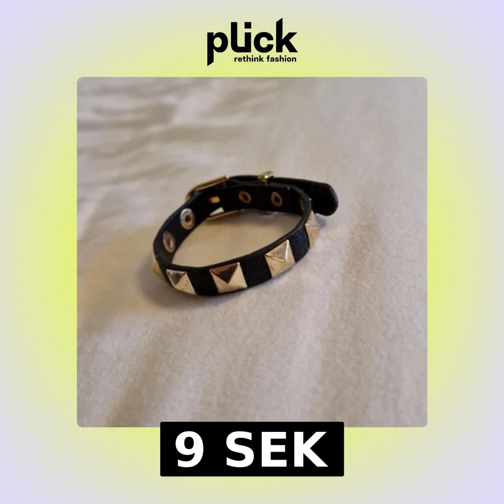 Coolt svart armband med guldiga pyramidformade nitar och justerbart spänne. Armbandet har en edgy vibe och passar perfekt för dig som gillar detaljer som sticker ut. Aldrig använd. Säljer för den var för stor för mig.