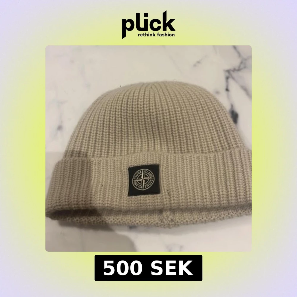 Snygg beige stickad mössa från Stone Island med uppvikt kant och logotyp framtill. Perfekt för att hålla värmen under kyliga dagar. En stilren accessoar som passar till det mesta.