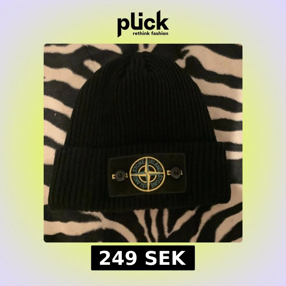 Svart ribbstickad mössa från Stone Island med klassisk logotyp-patch framtill, fäst med två svarta knappar. Snygg och enkel design, perfekt för kalla dagar. Materialet är mjukt och värmande, med en bred uppvikt kant.