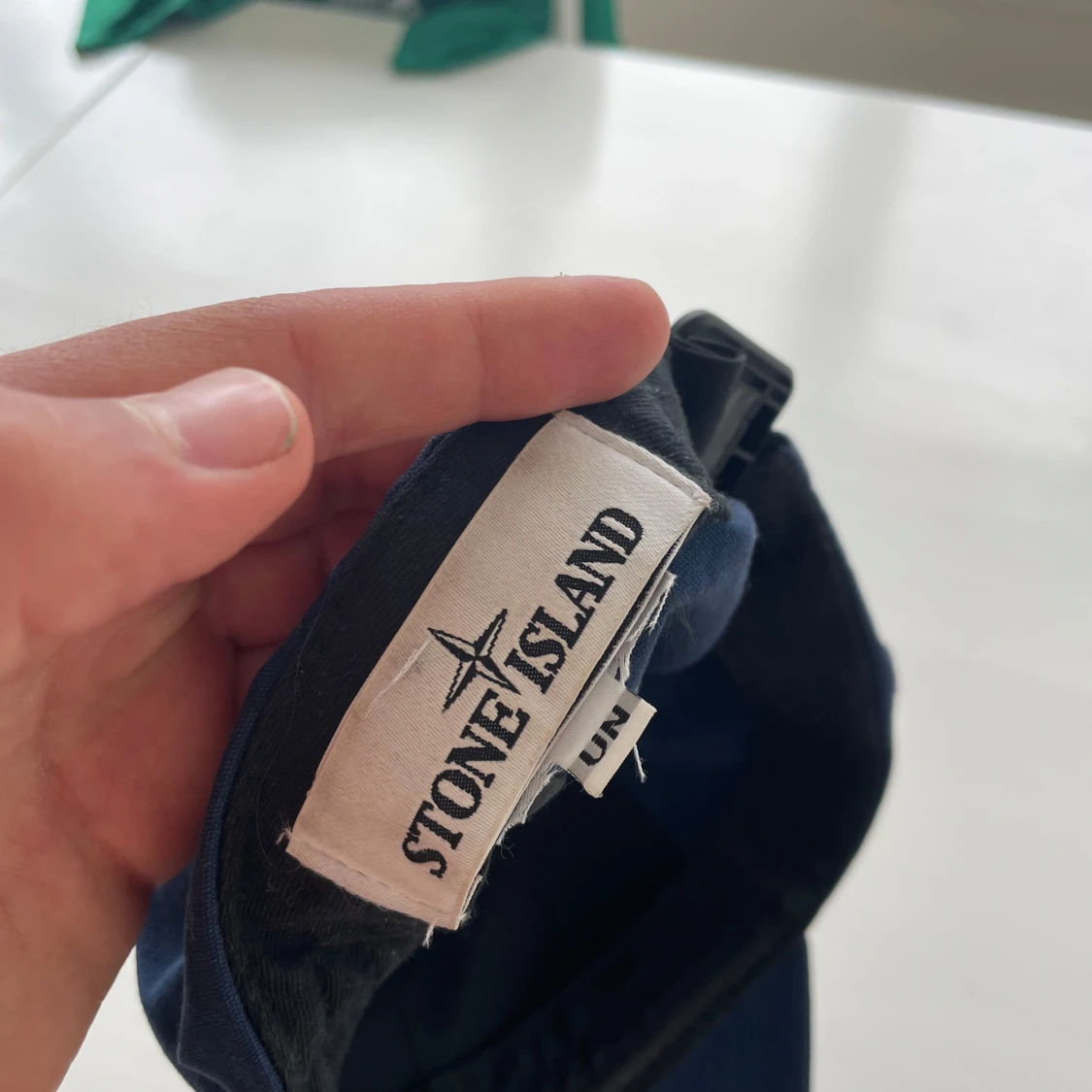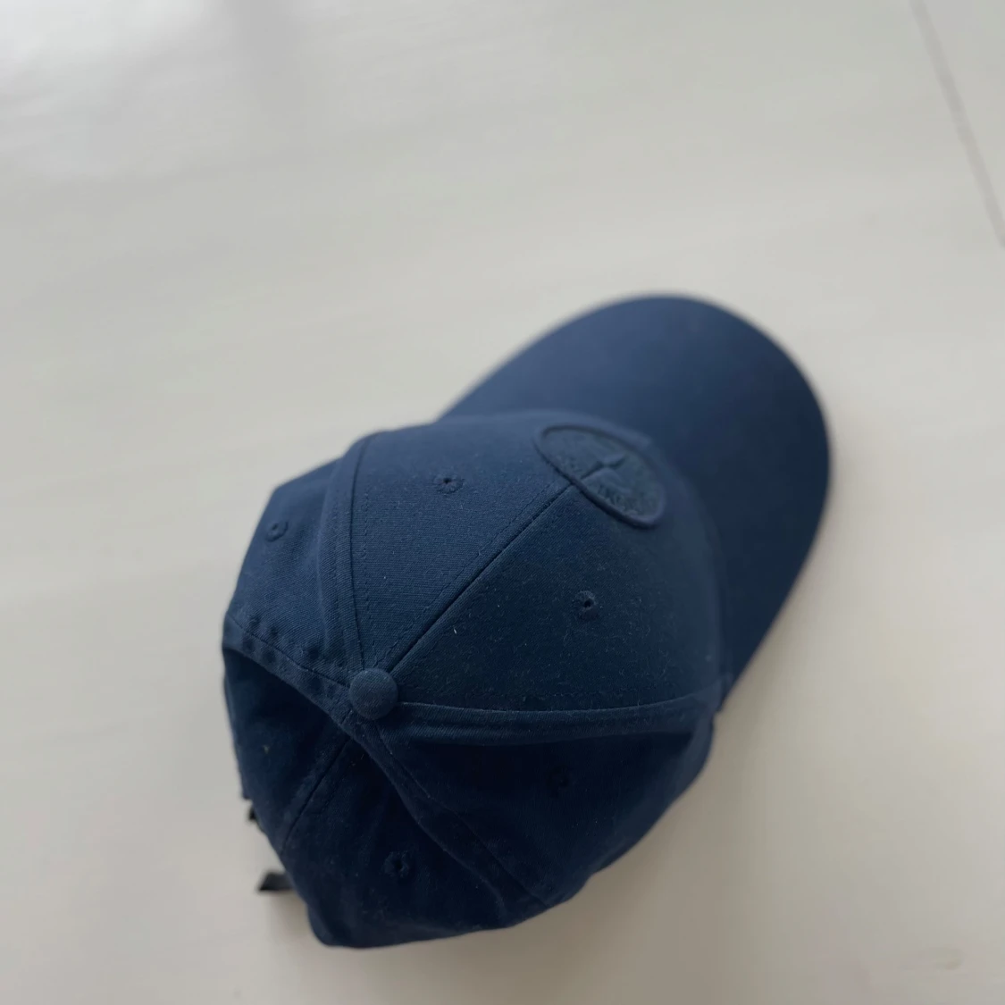 Snygg mörkblå keps från Stone Island med broderad logotyp framtill i samma färg som kepsen. Klassisk böjd skärm och justerbar rem baktill. Perfekt accessoar för en clean och sportig stil. Lappen inuti kepsen med QR-koden är bortklippt. Kepsen är köpt på NK för 1299kr.