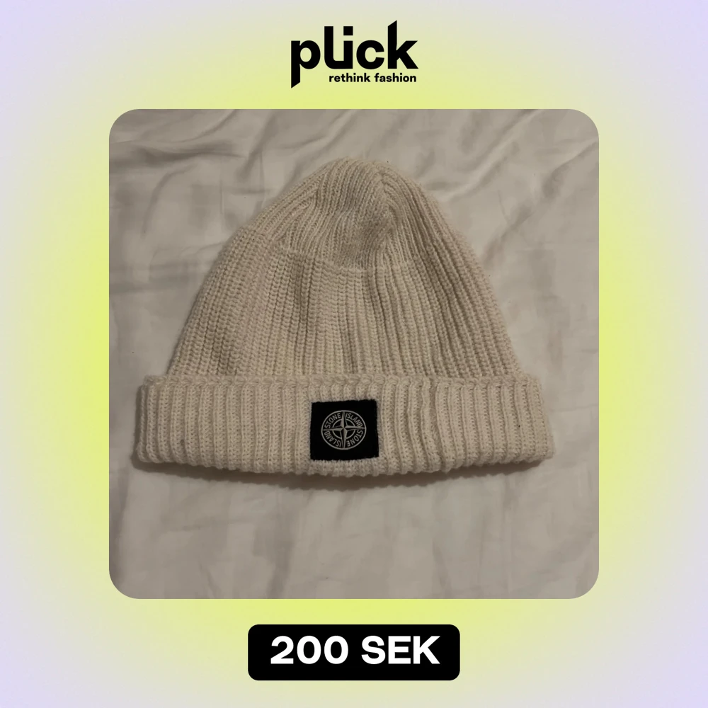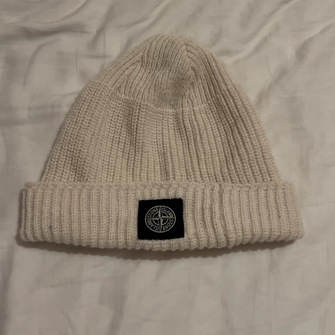 Säljer en snygg vit stickad mössa från Stone Island. Den har en ribbad design och en svart broderad logga framtill. Perfekt för att hålla sig varm under kyliga dagar. Passar både till vardags och mer avslappnade tillfällen.