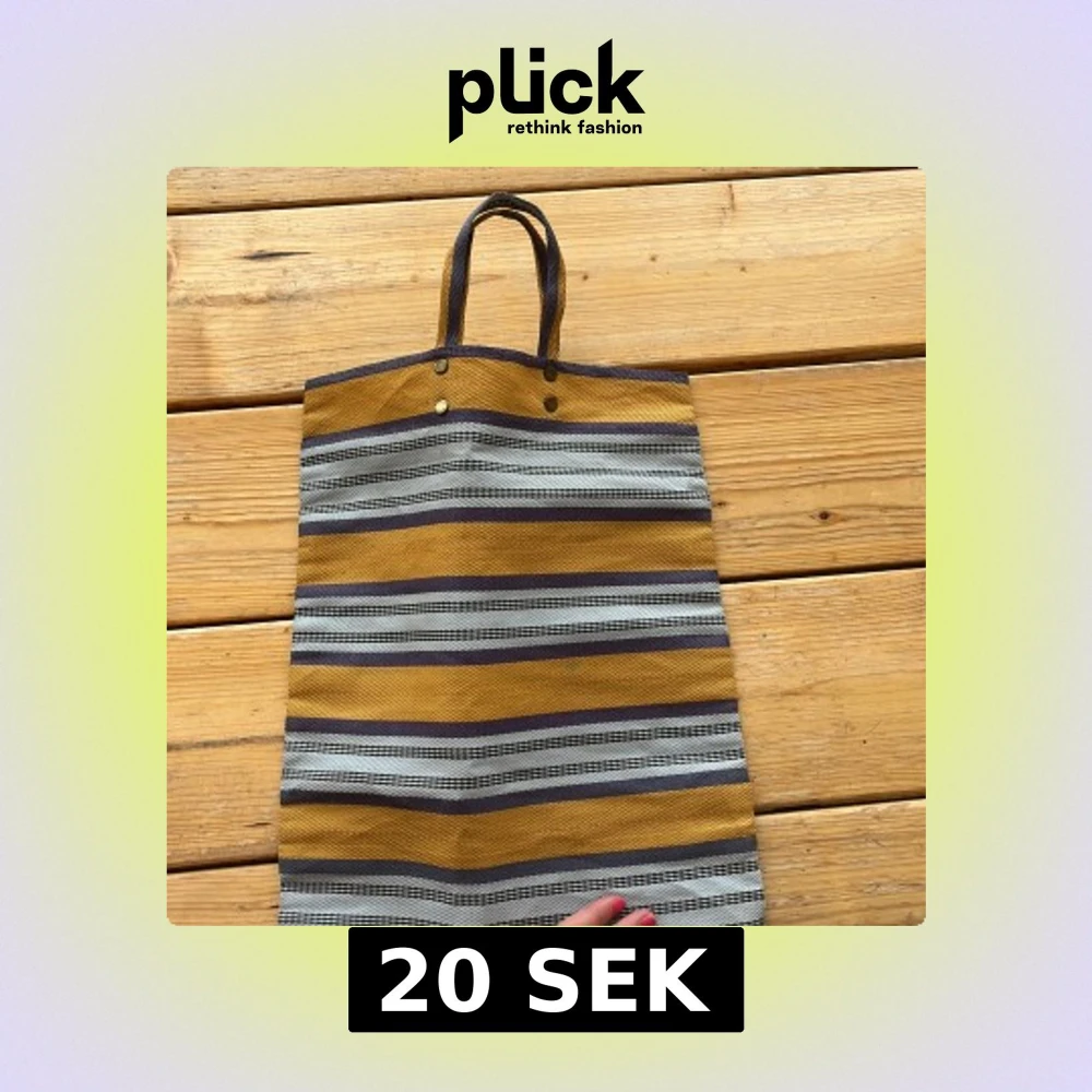 Säljer en randig shoppingväska i bomull med gula, gråa och svarta ränder. Väskan har två handtag och är perfekt att bära till skolan eller stan. Enkel och stilren design med mjukt tyg och rymligt fack.