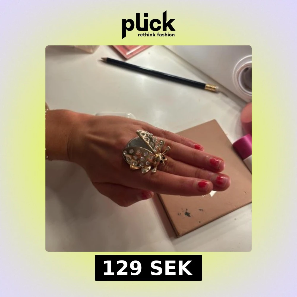 Unik och iögonfallande ring i form av en nyckelpiga, dekorerad med glittrande stenar. Ringen är i guld- och silverfärg med svarta detaljer på huvudet. Perfekt för dig som vill sticka ut och addera lite extra bling till din stil. jätte jätte snygg köpt i Grekland