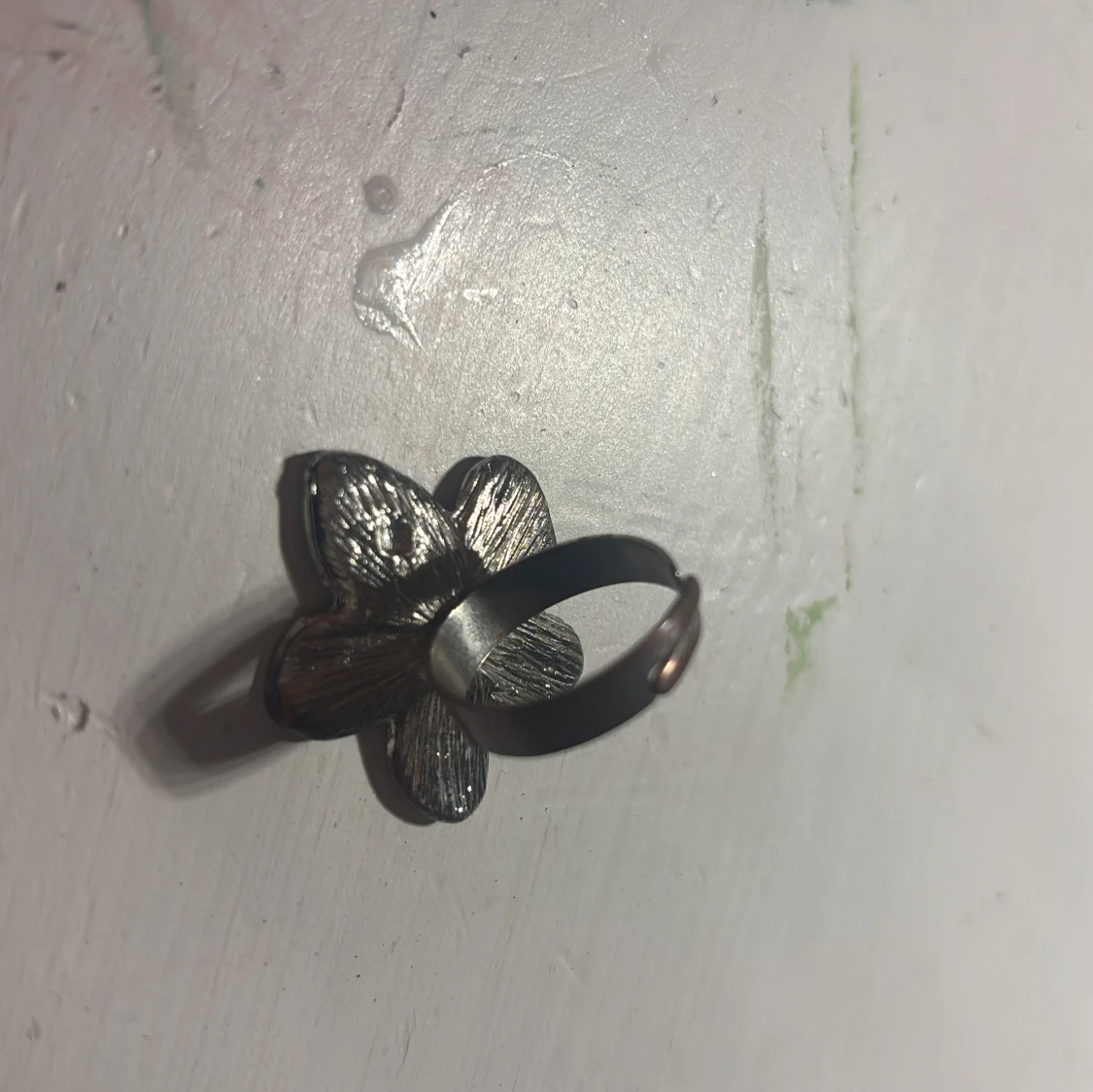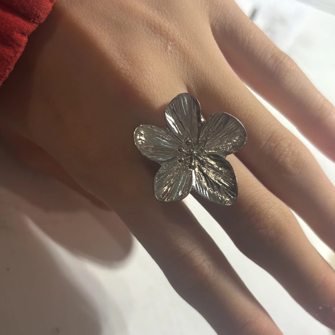 Säljer en statementring i silverfärg med en stor, detaljerad blomma som motiv. Ringen har justerbar storlek och blommans yta har fina ådringar som ger en cool och unik look. Perfekt för dig som vill sticka ut med accessoarer!