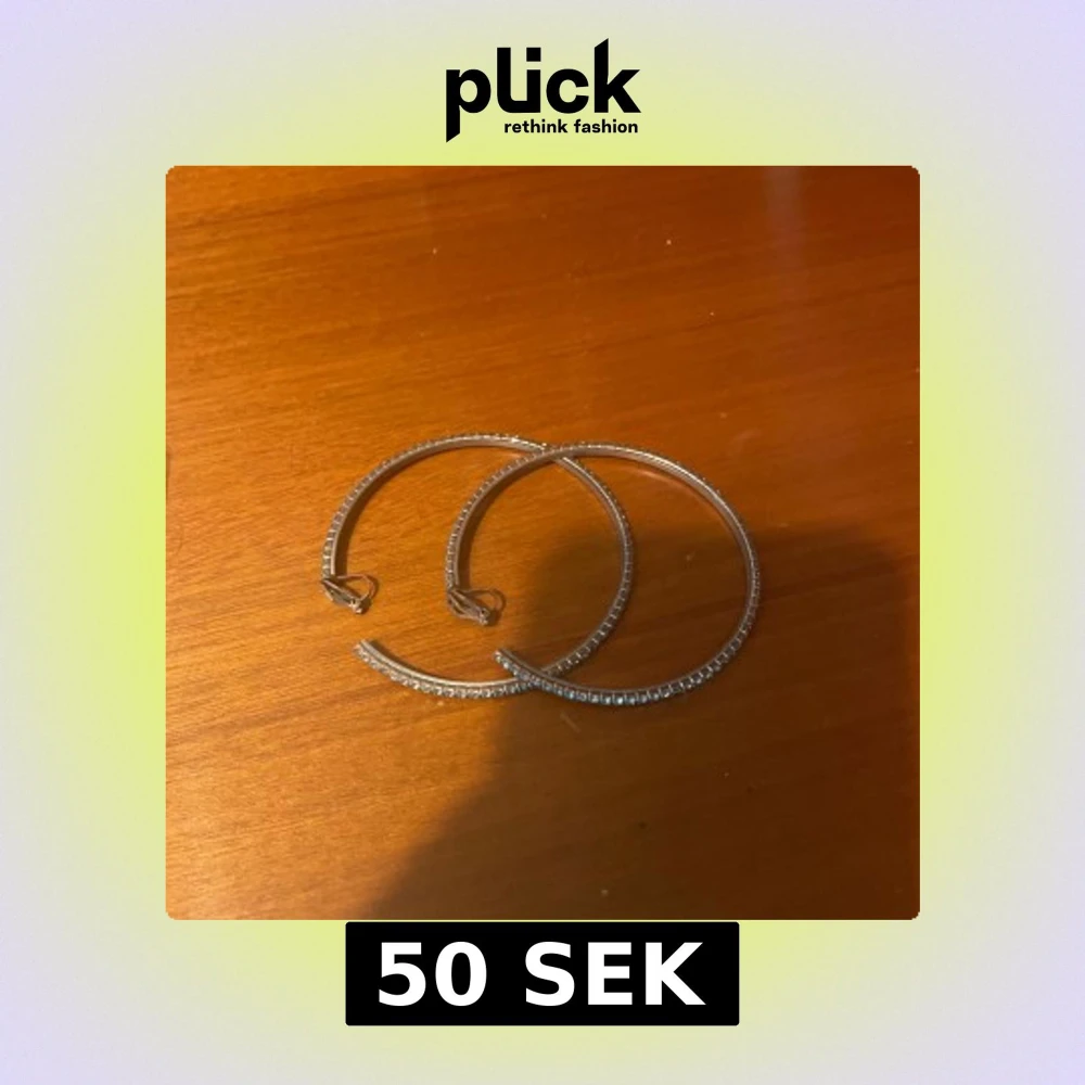 Säljer ett par stora, runda hoops örhängen (clips) i silverfärg med glittriga stenar längs hela kanten. Perfekta för dig som vill ha ett par örhängen utan att ha hål, med extra bling såklart!