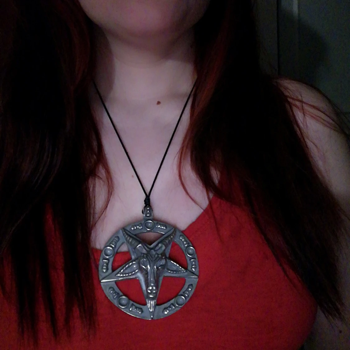 Ett rejält pentagram med ett jet huvud i och mönster runt på sirklen. Svart skusterbara snören.