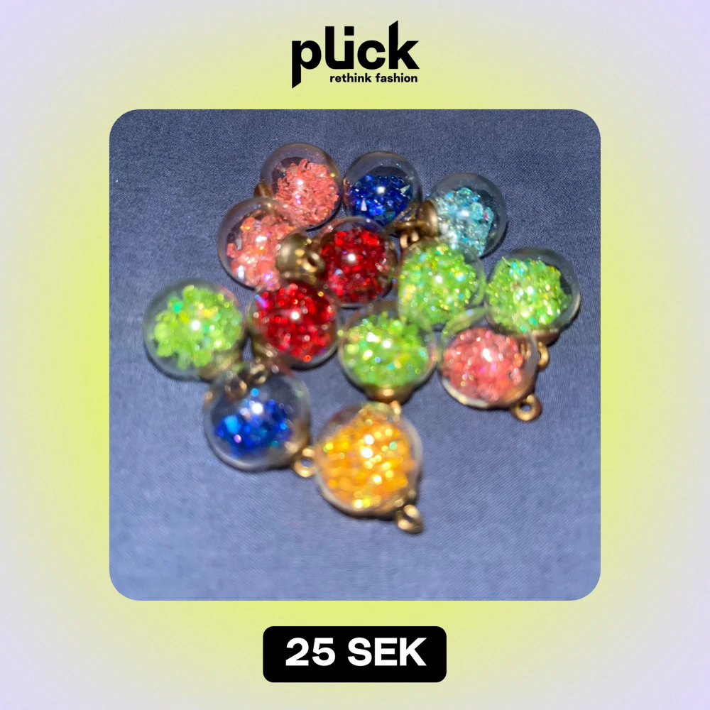 Säljer 13st supersöta kulor med strass inuti. Perfekta att sätta på smycken eller knipsa fast på till exempel en väska som dekoration. Till jul och nyår så kan man ha de som örhängen. Super att ha till alla ceremonier året om.